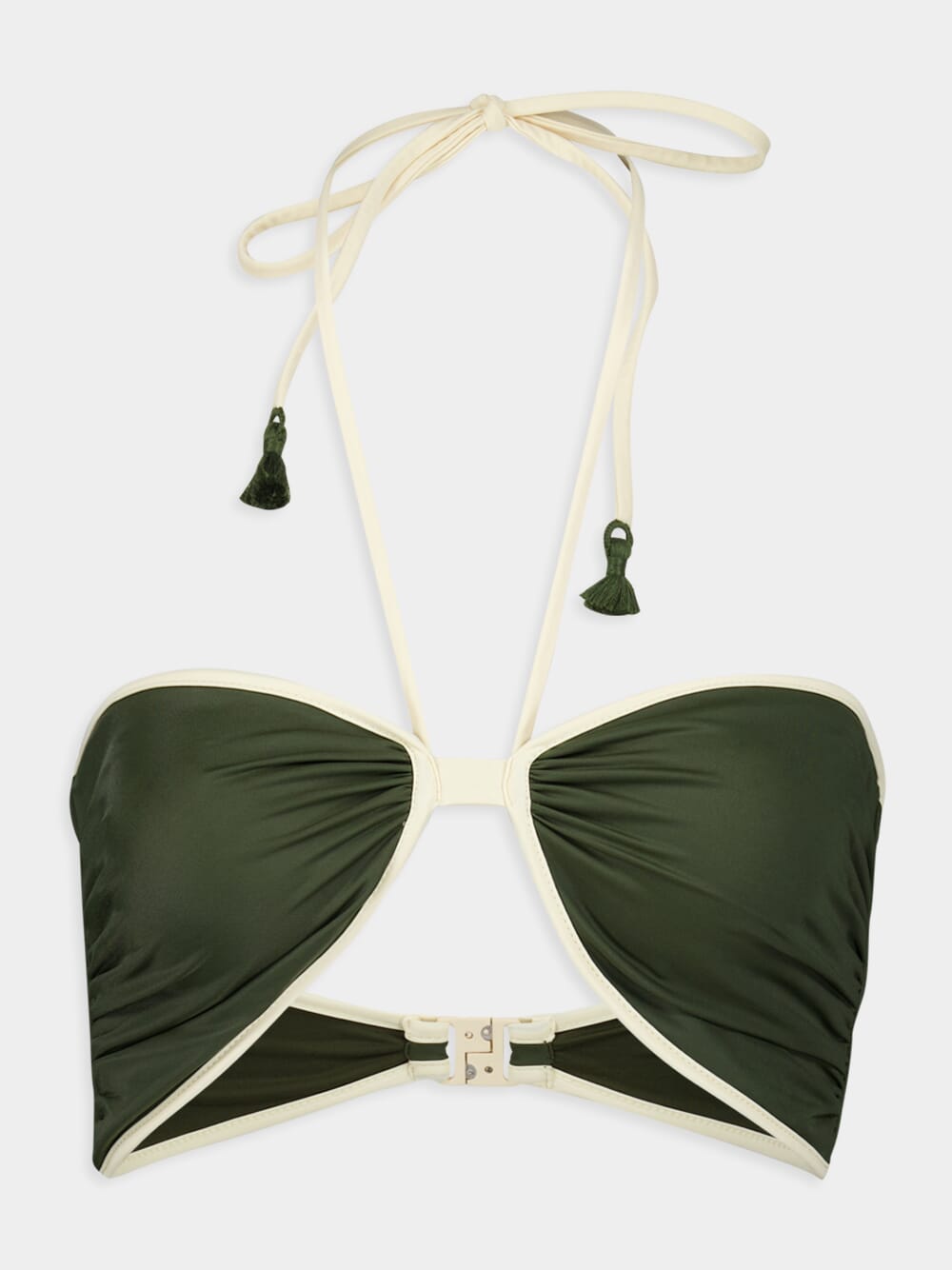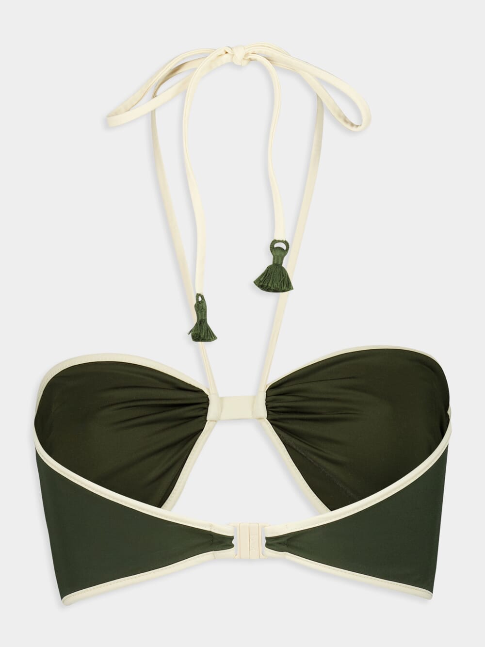 Dive into the waves with confidence in this military green bikini top featuring metallic accents and a tie-fastening detail. The adjustable straps and removable padding offer customizable support, while the vibrant color adds a pop of personality to your swimwear collection. Embroidered tassels enhance its unique style, making it a standout piece for any beach or poolside occasion.