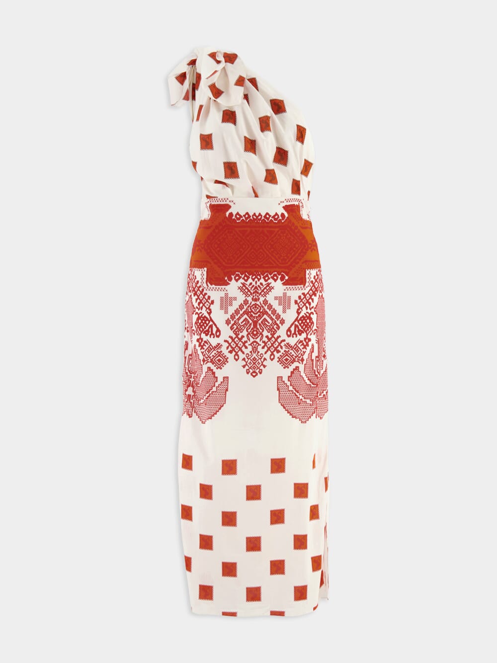 JOHANNA ORTIZ Goddess One Shoulder Dress, a stunning fusion of fiery red and pure white. This exquisite dress features a vibrant red hue that commands attention and ignites passion. The elegant one-shoulder design exudes timeless sophistication, while the delicate white accents add a touch of grace. Crafted with meticulous care, it offers both comfort and style, allowing you to make a bold statement at any occasion.
