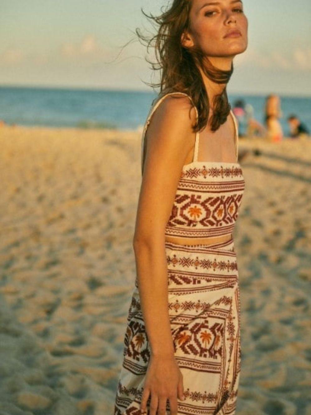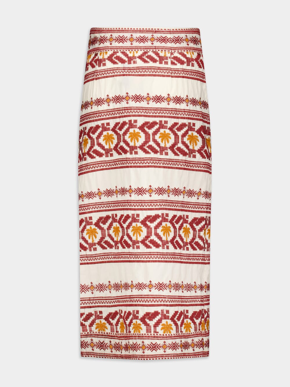 Pleno Sol-Embroidered Cotton Wrap Skirt, crafted from soft and breezy voile, this skirt features an intricate embroidered design, showcasing impeccable craftsmanship. With a high-waisted silhouette, it offers a flattering and elegant fit. The wrap design adds a touch of femininity and versatility to your look. The concealed front button fastening ensures a seamless and sleek finish. Embrace a mid-length style that complements any outfit effortlessly.