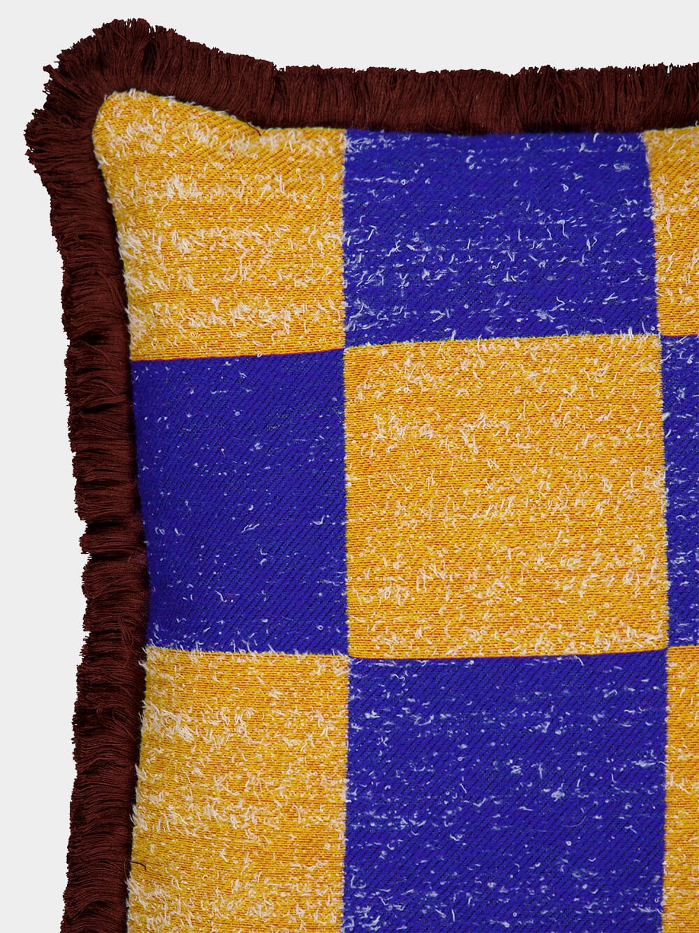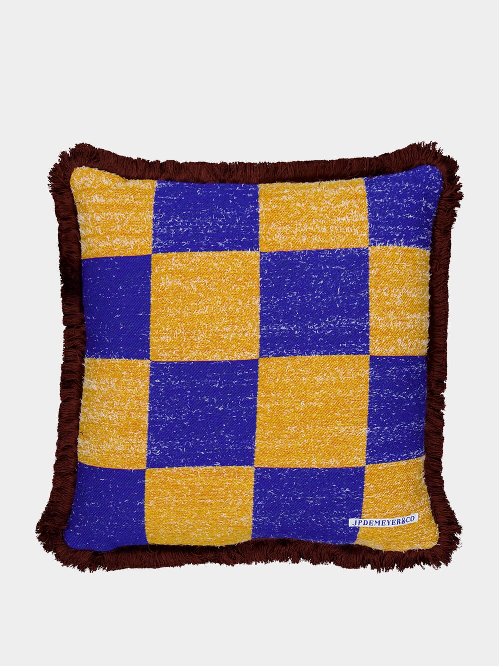 The Visage Yeti BB Cushion is a handcrafted piece from Belgium that merges whimsical design with refined textile artistry. The front features a stylised face motif in burnt orange and neutral tones, while the back displays a bold yellow and blue checkerboard pattern. Trimmed with artisan-made brown marabout and filled with premium goose down, it adds both personality and comfort to any sophisticated living space.