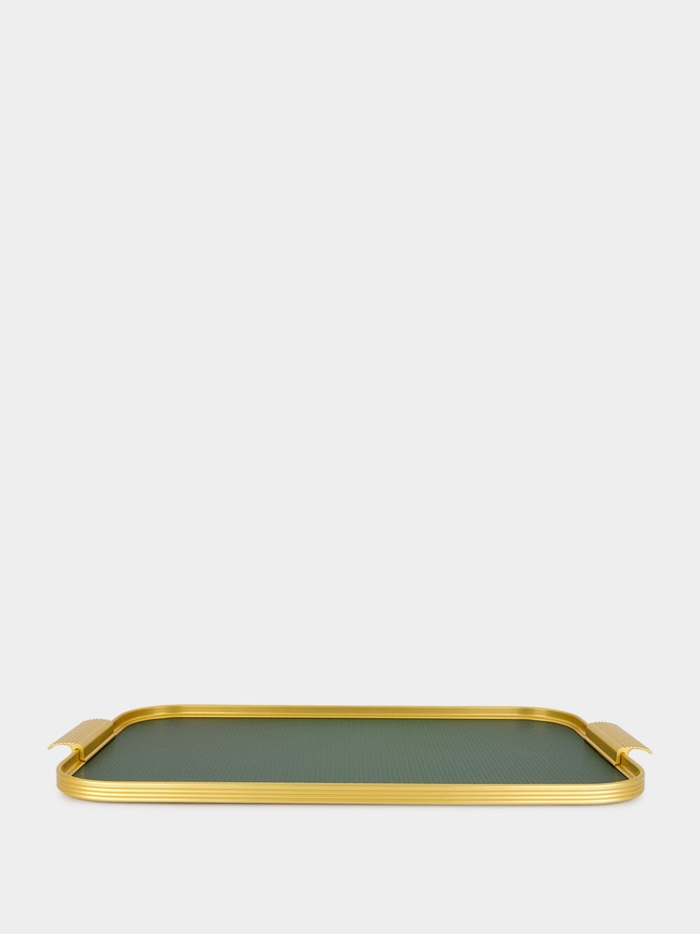 This elegant forest green lap tray is a timeless piece from Kaymet, designed to bring sophistication to your home. Crafted from anodized aluminum, it features a ribbed edge with two carry handles for easy transport. The silicone rubber grips ensure stability, making it perfect for enjoying breakfast in bed or serving guests with style. This luxurious tray has been a part of Kaymet's distinguished collection since 1947 and was even featured in Vogue in 1955, attesting to its enduring appeal and quality.