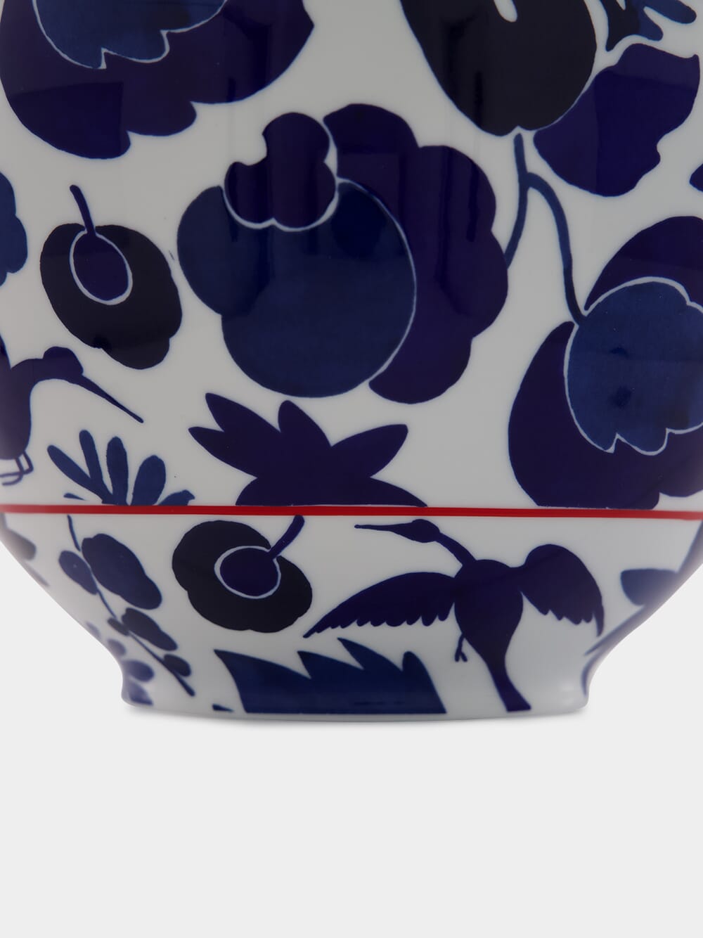 La DoubleJ Bubble white and blue porcelain vase with handpainted motifs in Wildbird print and 18k gold trim.