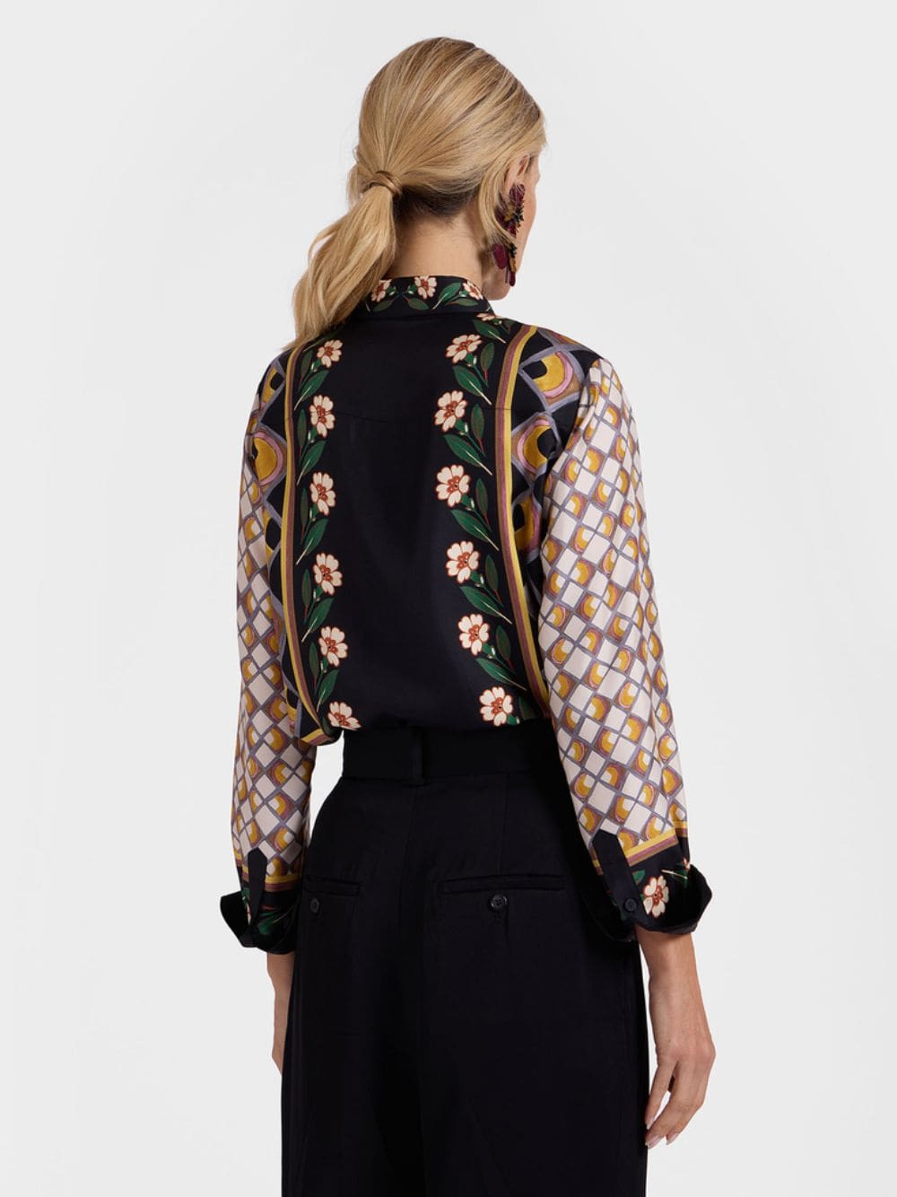 The Boy Shirt Dazed Placée Black in Silk Twill offers a timeless elegance, crafted from luxurious silk twill from Lake Como. With a classic button-down silhouette, this straight-cut shirt features a vibrant placement print, silk-covered buttons, and slightly gathered sleeves for a feminine touch. A versatile piece, it pairs beautifully with both formal trousers and casual denim.