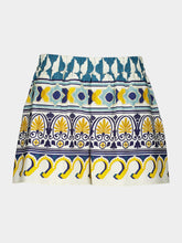Casareale Small Cream Pull-Up Shorts are the epitome of summer chic. Made from light summer poplin, they feature a comfortable elastic waistband and drawstring for an adjustable fit. Side pockets add practicality to the vivid patterned design that hits at mid-thigh, perfect for sun-drenched days.