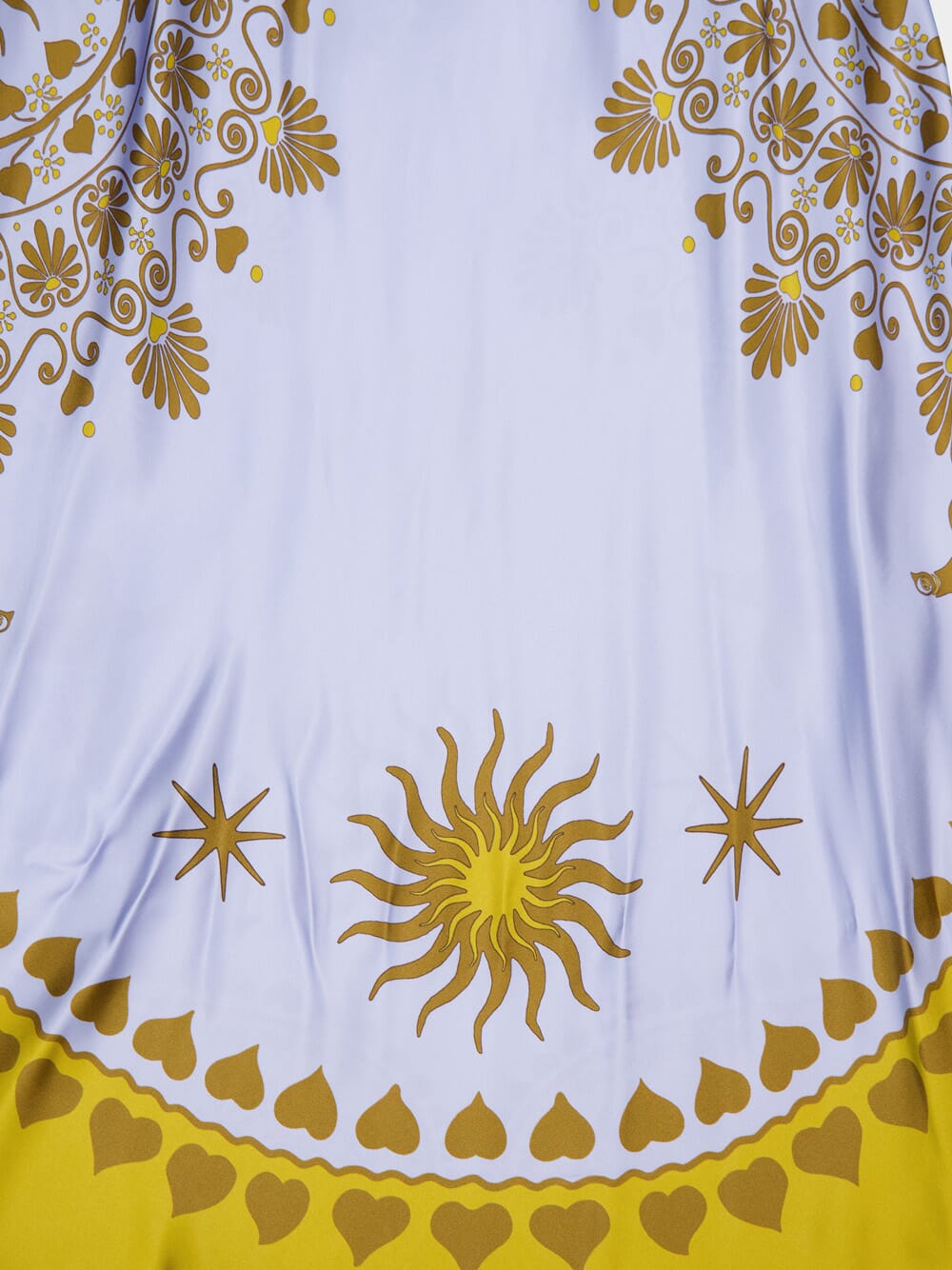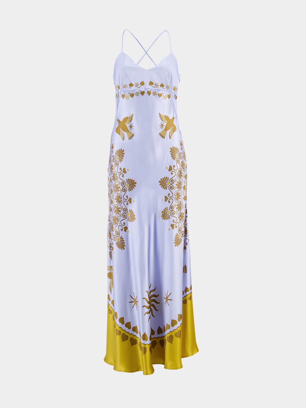 This long satin slip dress showcases a captivating all-over graphic print in soft hues of white, gold, and yellow. Featuring a flattering V-neck and delicate crossover shoulder straps, it exudes elegance and sophistication. The straight hem and smooth satin finish enhance the luxurious feel of the dress, making it ideal for evening events or summer gatherings. Its relaxed silhouette and long length offer a timeless and graceful look.