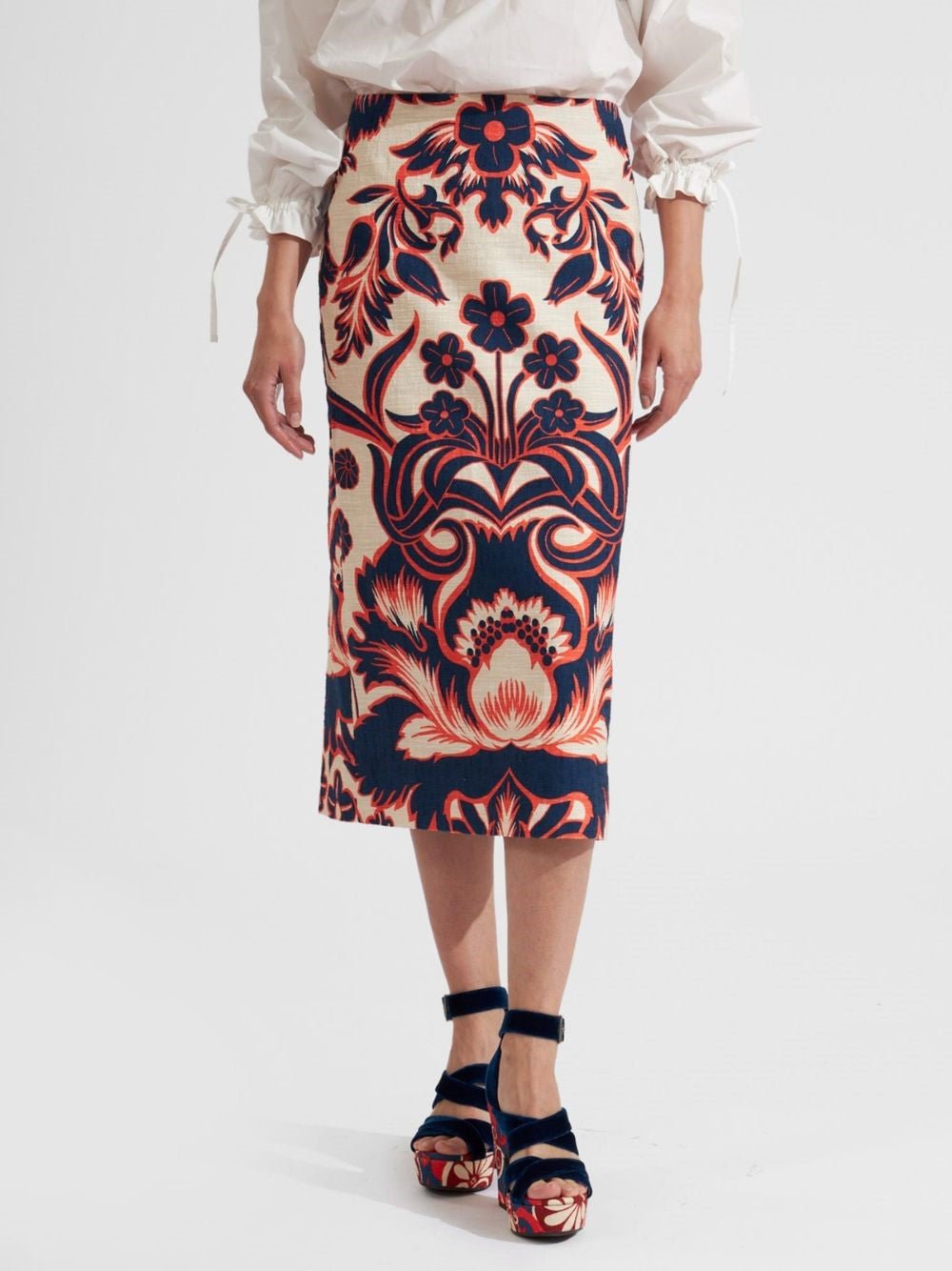 Floral-Print Pencil Skirt, crafted with stretch-cotton fabric, this skirt offers both comfort and style. The all-over floral print adds a touch of femininity and charm to your look. With its pencil silhouette, it effortlessly flatters your figure. The concealed rear zip fastening ensures a seamless fit. Complete with a straight hem and mid-length, this skirt is perfect for various occasions.