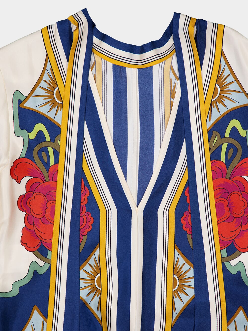 Magnifico Long Dress, a breathtaking fusion of vibrant multicolours and luxurious silk. This dress is a true masterpiece, designed to make you feel like a vision of elegance and grace. Crafted with the finest silk, it drapes effortlessly and exudes a sense of opulence. The stunning multicoloured pattern adds a mesmerizing allure, making it perfect for formal events or special occasions.