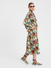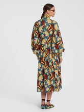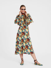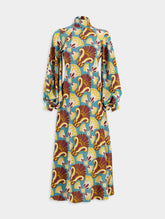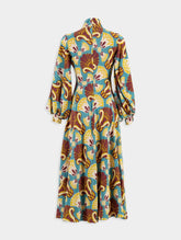 Medici Silk Midi Dress, a stunning piece crafted from premium silk crepe de chine. Its captivating all-over graphic print adds a touch of artistry to your look. The bias cut enhances the drape and flow of the dress, while the high neck exudes elegance. A concealed rear zip fastening ensures a seamless fit, while long puff sleeves with buttoned cuffs add a fashionable touch. With a fitted waistline, flared skirt, and mid-length silhouette, this dress combines style and comfort effortlessly, culminating in a graceful flared hem.