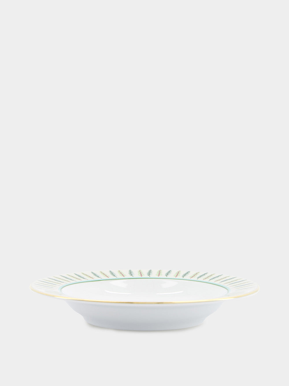 Soup and Dinner Plate Set includes one soup plate and one dinner plate, both crafted with exquisite attention to detail using Italian-made porcelain. Each plate is hand-painted with intricate designs, creating a unique and artistic touch. The plates are beautifully accented with a hand-painted 18K gold trim, adding a luxurious and elegant finish.