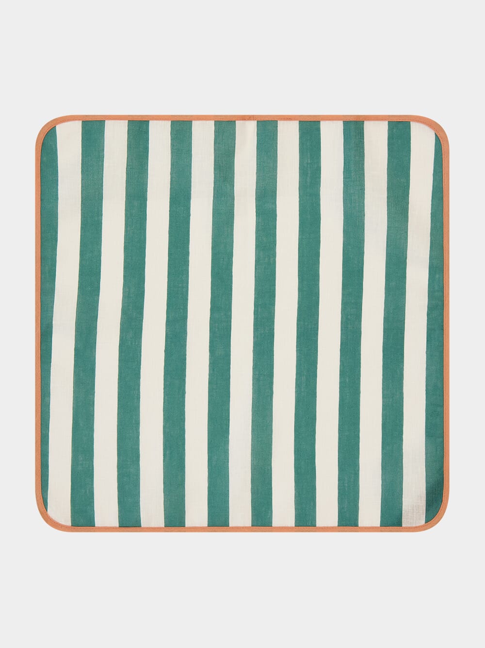 Add a touch of elegance to your dining table with this stylish set of two striped napkins, crafted from 100% Italian linen. Featuring a vibrant green and white stripe pattern with a contrasting orange trim, these napkins bring a fresh, nautical vibe to your table settings. Perfect for both casual gatherings and sophisticated dinners, they pair beautifully with other patterned table linens for a striking, maximalist effect. Made in Italy, these napkins are machine washable and designed to last, blending practicality with refined design.