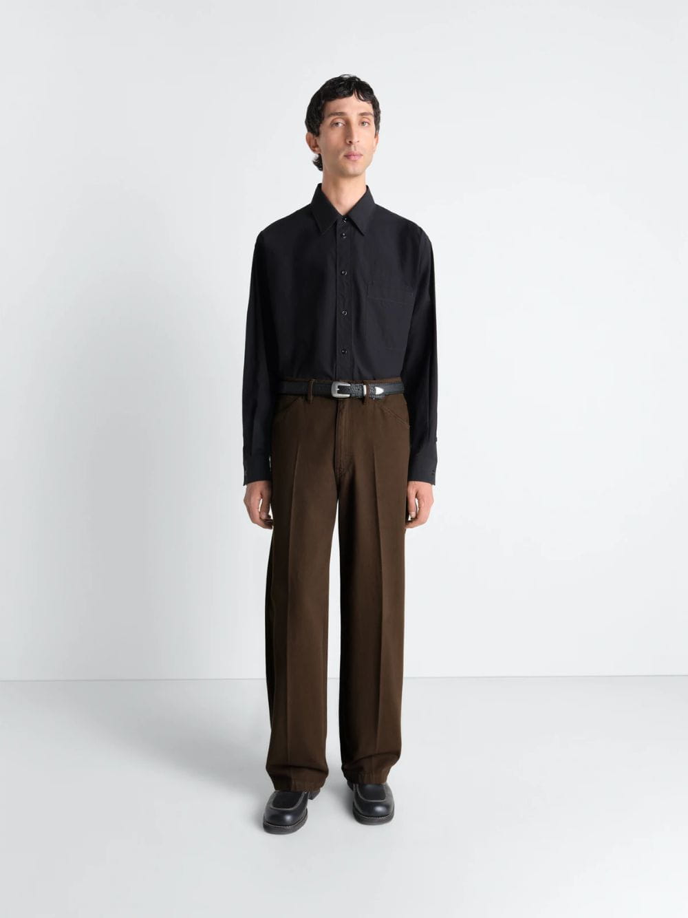 Crafted from dyed broken twill in a rich cacao brown tone, this LEMAIRE trucker jacket offers a refined interpretation of a workwear classic with fluid drape and clean tailoring. The straight-cut silhouette features a spread collar, front button closure and buttoned cuffs, while patch chest pockets with flaps reinforce its utilitarian identity. An embossed leather LEMAIRE patch inside the neckline completes the design with discreet signature detail.