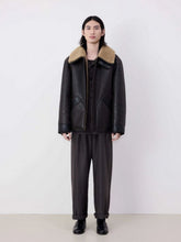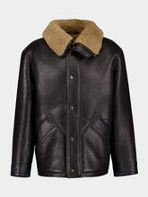 This espresso brown shearling coat from Lemaire is an outdoor essential, crafted from heavy lamb leather shearling for ultimate warmth and comfort. It features grained cow leather details on the pockets, collar adjuster, and neckline. The coat's boxy, straight-cut silhouette is reinforced with a protective tap along the bottom hem for added structure. Gunmetal snap buttons on the front and collar ensure secure fastening, while the shearling lining extends to the pockets for enhanced insulation. Ideal for colder seasons.