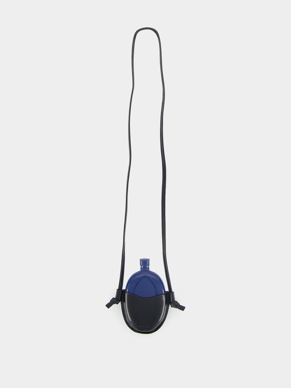 Flask Necklace, expertly crafted from premium vegetable-tanned leather, boasting a refined compact grain and a sleek finish. This unique accessory seamlessly blends fashion with functionality, featuring a lacquered metal flask elegantly enclosed within a meticulously molded leather pouch. Complete with a coordinating leather strap, accentuated with knotted tips, it offers effortless wear as a chic necklace or stylish crossbody accessory.