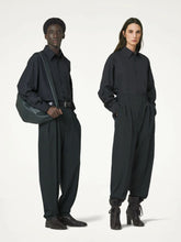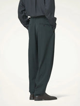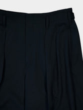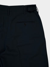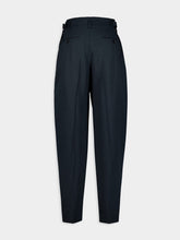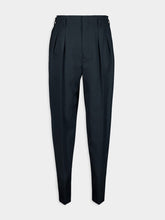 Pleated Tapered Wool Pants, a unisex fashion statement. Crafted from wool gabardine, these pants feature a smooth drape, perfect for mid-season tailoring. The minimal waistband offers adjustable comfort with buckled tabs on both sides. The wide leg showcases double pleating for added structure, elegantly tapering in at the ankle.