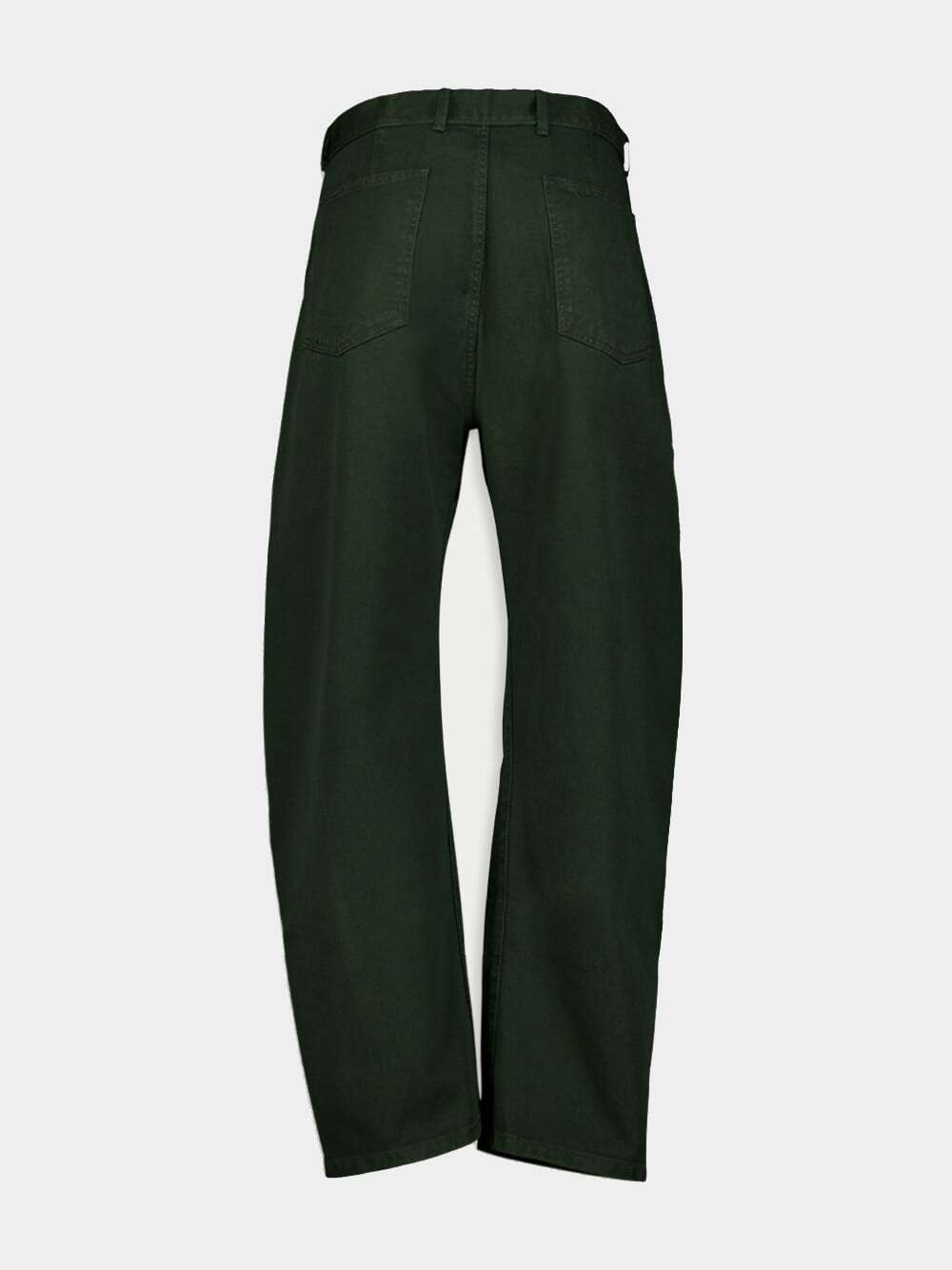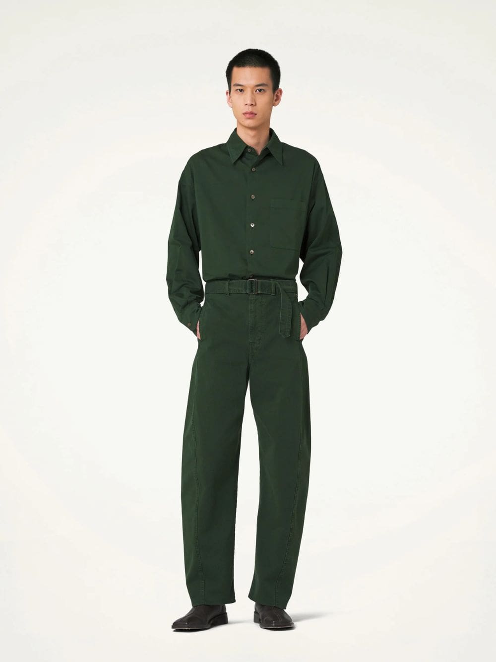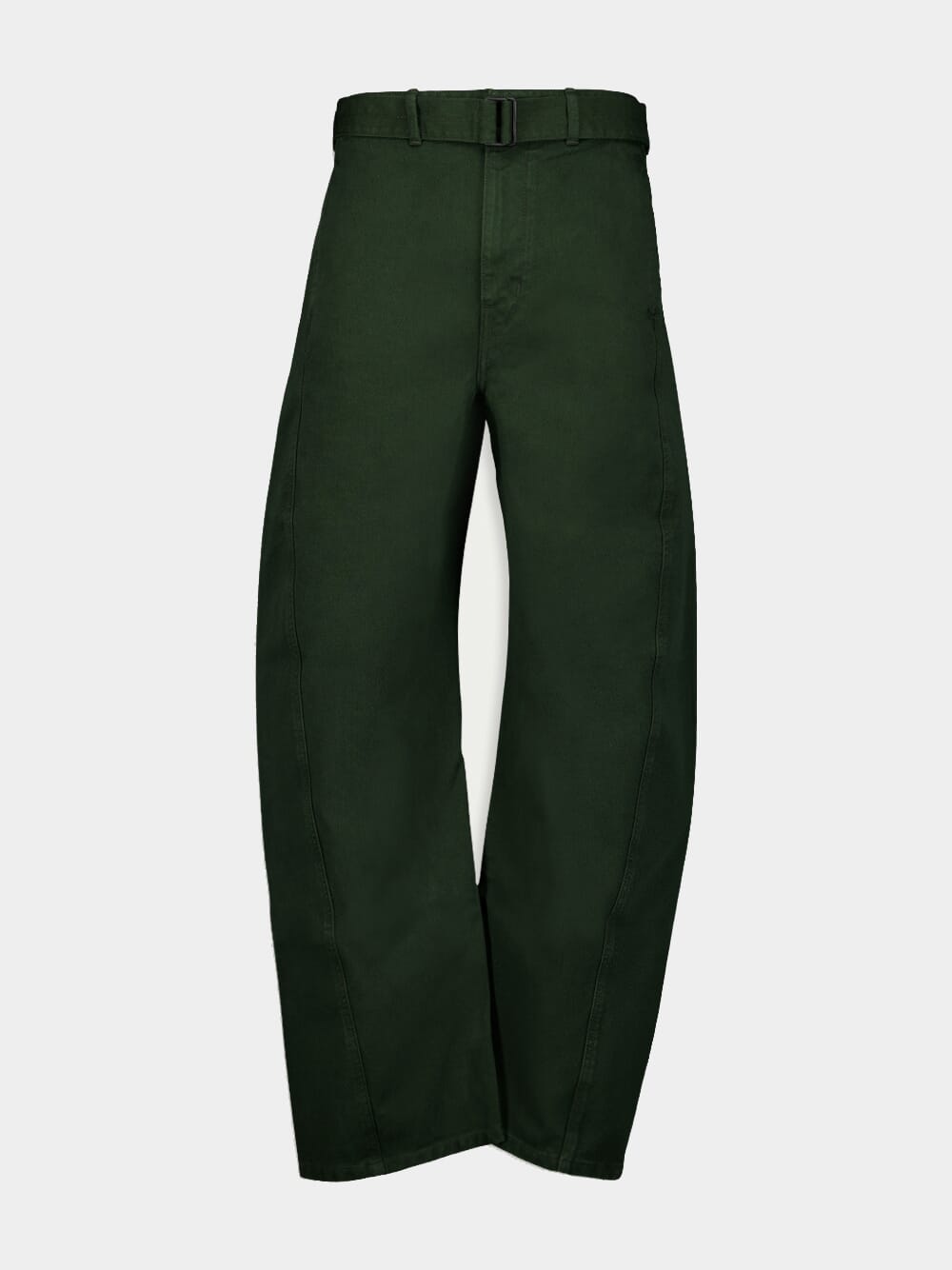 Twisted Belted Pants, a unisex classic in heavy denim with a visible twill weave and deep black wash for timeless style. The uniquely designed sideseams create a distinctive curved leg shape, while practical details include two side pockets, back patch pockets, and eye-catching contrast stitching. Enjoy an elongated midrise fit, complemented by a matching belt for adjustable waist perfection.