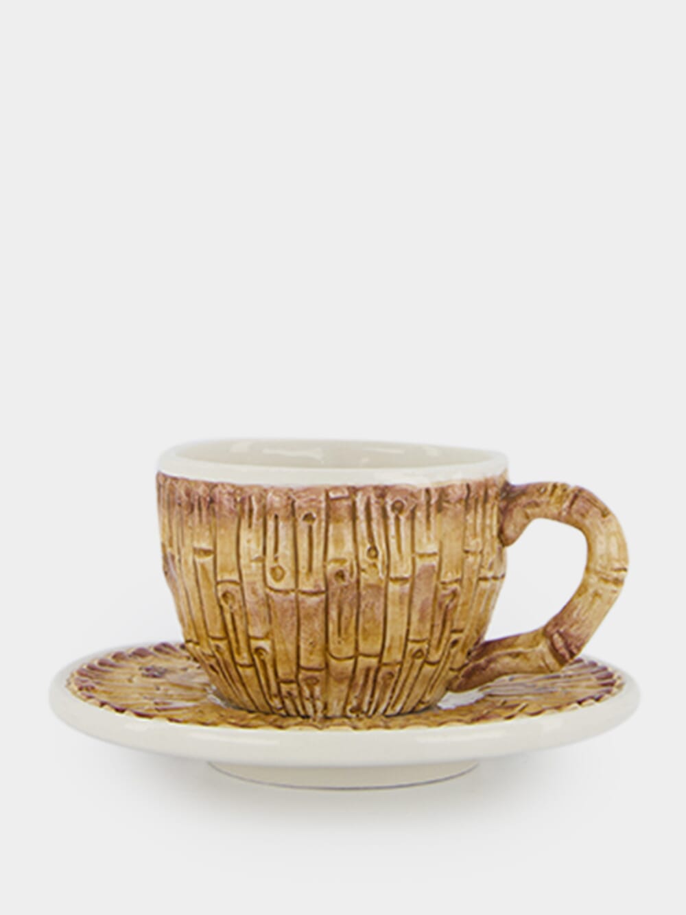 This ceramic coffee cup features intricate hand-painted bamboo designs that add a touch of nature-inspired beauty to your morning routine. The warm tones of brown and white create a soothing palette that enhances your coffee drinking experience.