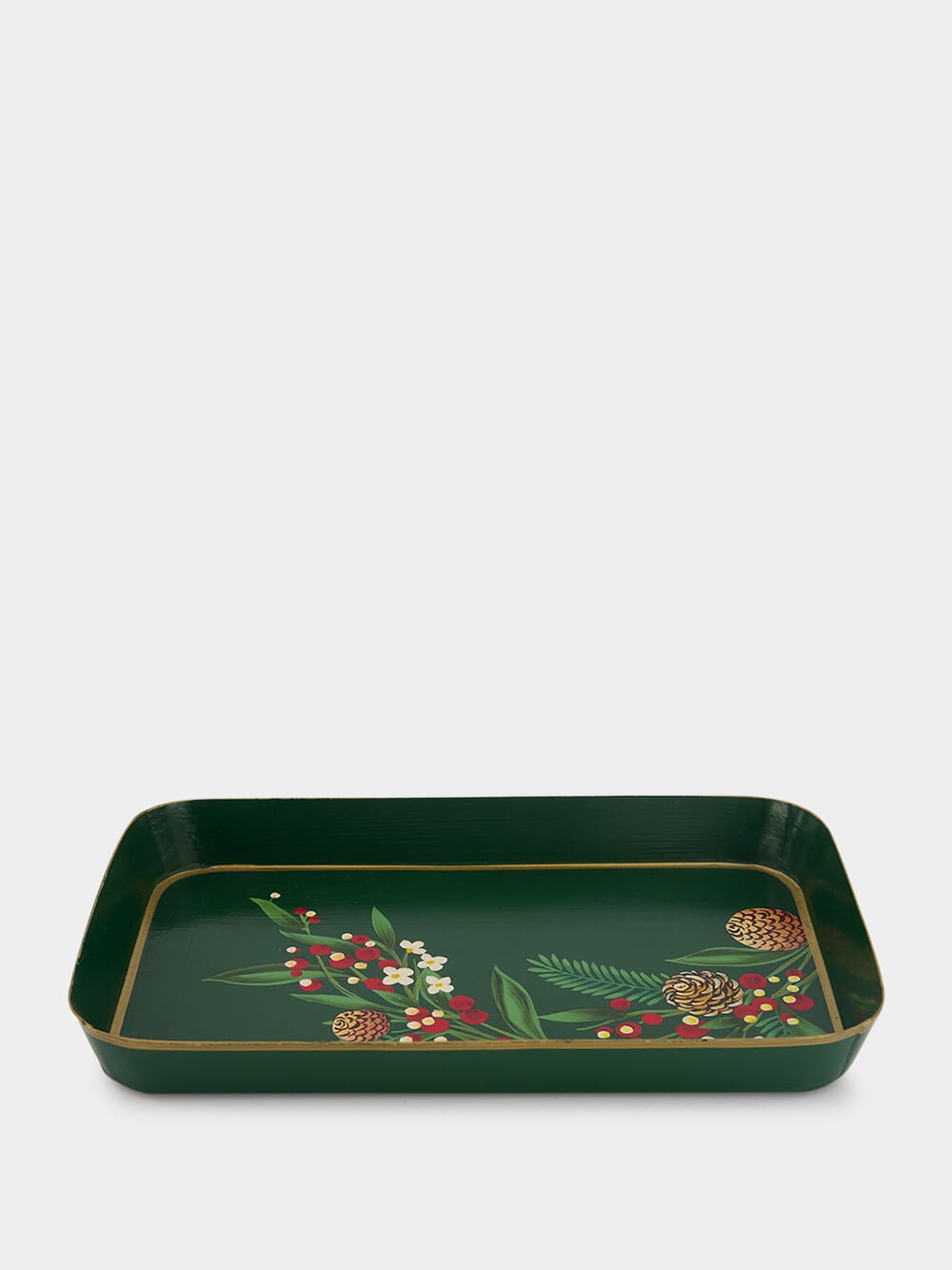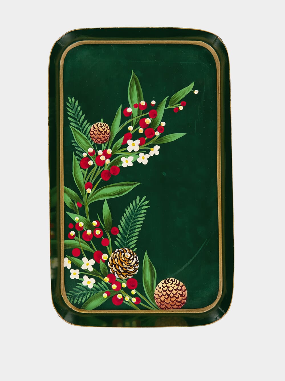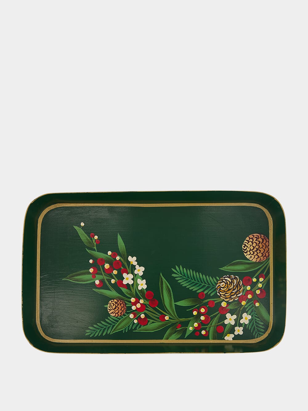 Les Ottomans green iron tray with handpainted christmas pattern.