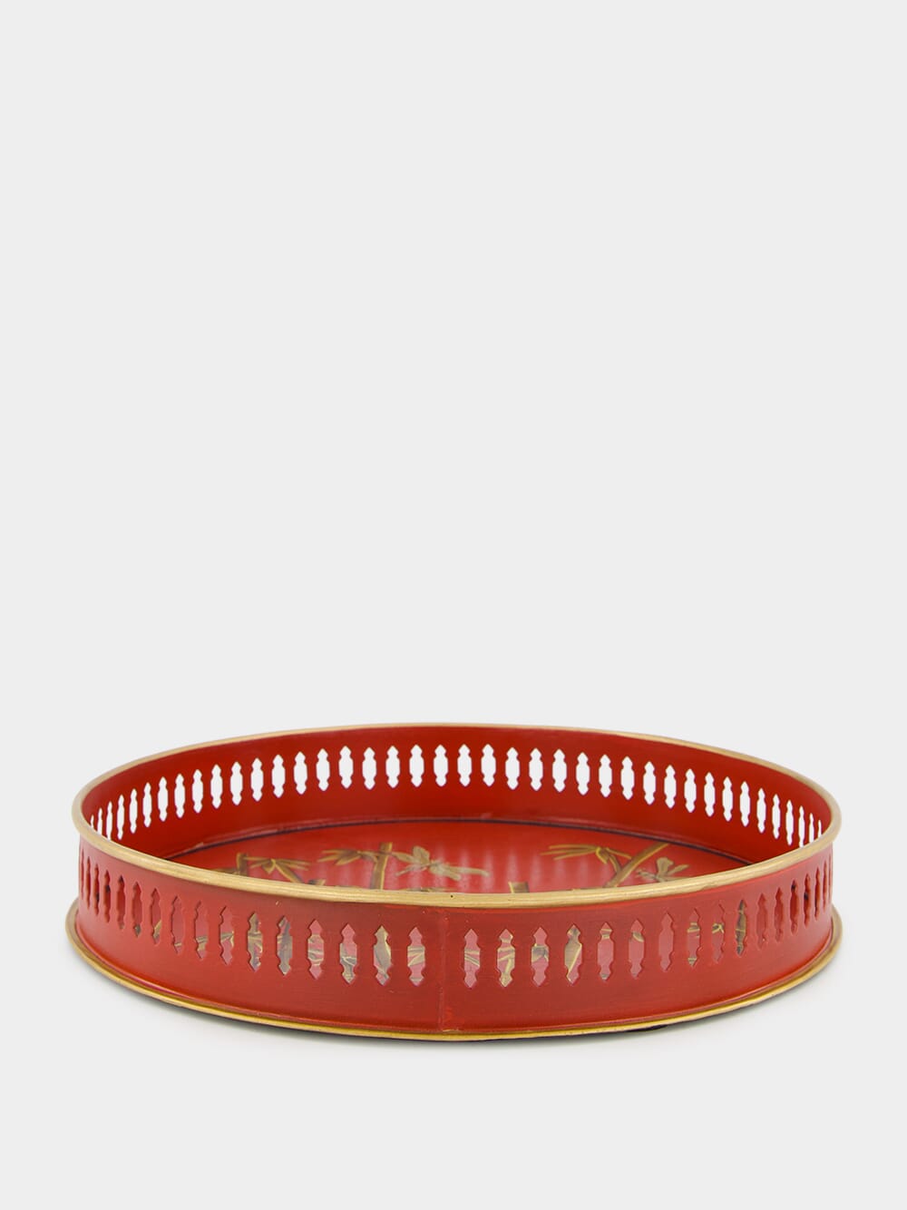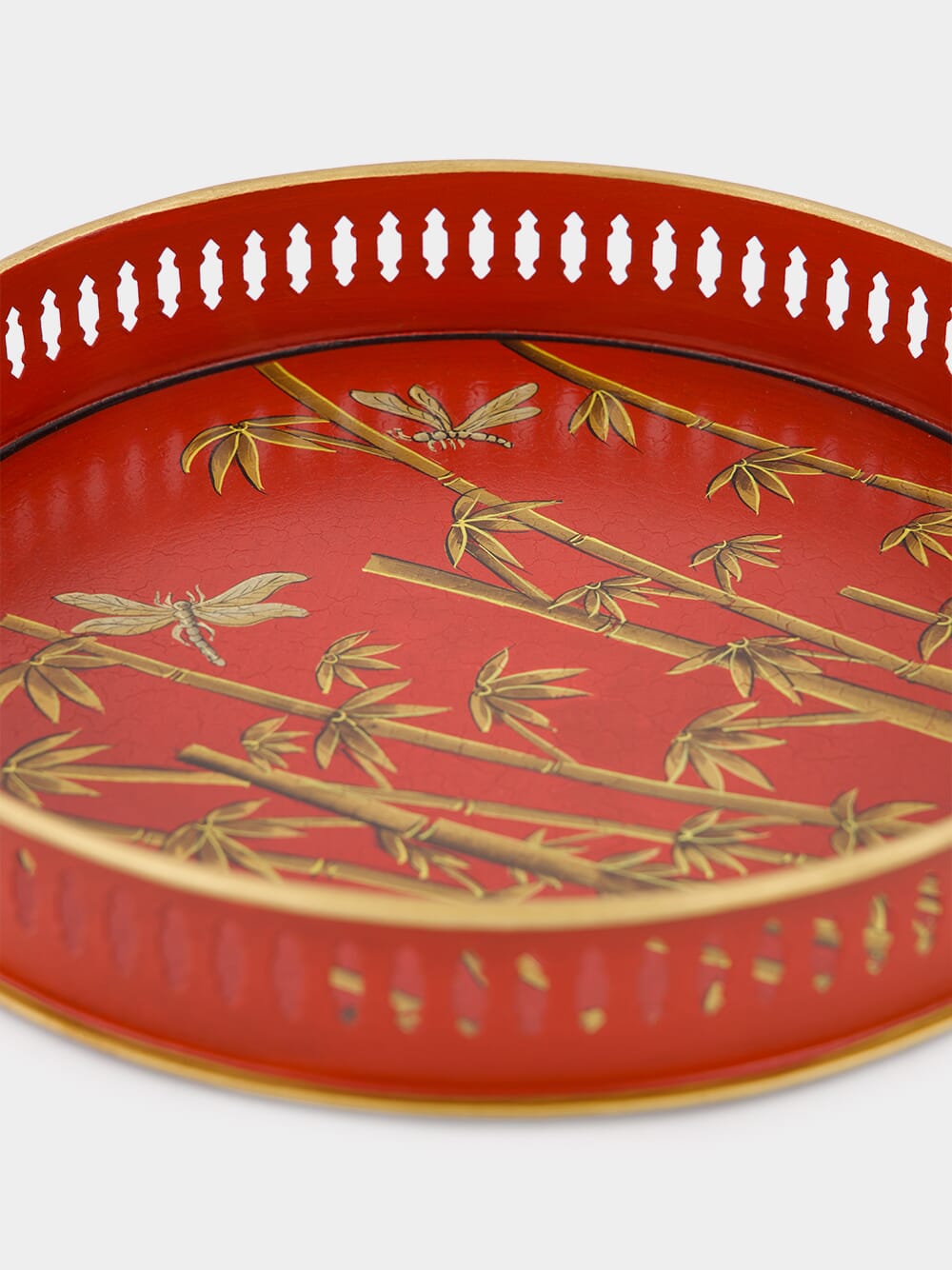 Les Ottomans Flora collection, circular red iron tray with handpainted bamboo motifs and gold rim.
