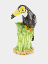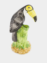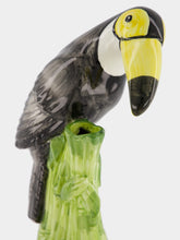 Capturing the essence of the rainforest, this ceramic toucan figurine perched on a tree stump is a vibrant nod to wildlife. With its striking black and yellow plumage and lifelike details, it serves as an exquisite piece for nature enthusiasts and adds a dash of the exotic to any room.