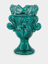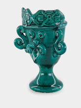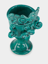 This cup stands out with its deep emerald glaze and intricate scrollwork. A piece reminiscent of the Renaissance era, it exudes luxury and artistry. The vessel's bold color and elaborate details make it a sumptuous addition to any collection, perfect for those with a taste for classical beauty.