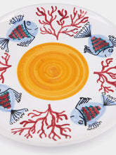 This exquisite dinner plate from the Sicily collection features a vibrant handpainted design that showcases colorful fish and coral motifs surrounding a sunny yellow center. Crafted from high-quality ceramic, it adds a touch of Mediterranean charm to any table setting. The plate's intricate artwork and rich colors make it a standout piece, perfect for both everyday dining and special occasions.