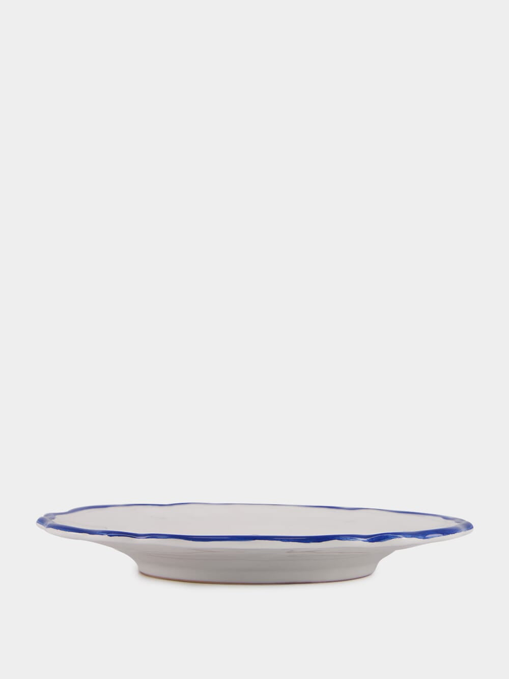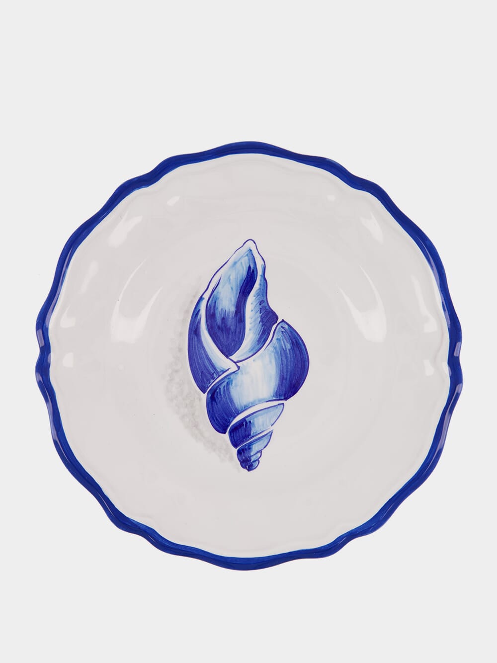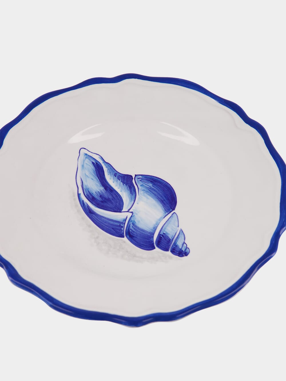Les Ottomans La Menagerie D'ete collection, white ceramic dessert plate with blue trim and handpainted Shell.