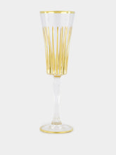 Indulge in the opulence of this crystal flute, adorned with slender gold stripes that shimmer with refined grace. Ideal for celebratory toasts, it brings a touch of luxury to any occasion and dazzles with its timeless elegance.