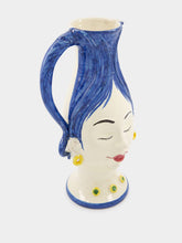 This ceramic jug is a vibrant tribute to Sicilian artistry, featuring the serene face of a woman and flowing blue locks that serve as a whimsical spout. Adorned with colorful details, it's a functional piece that doubles as a vase, infusing any space with Mediterranean charm.
