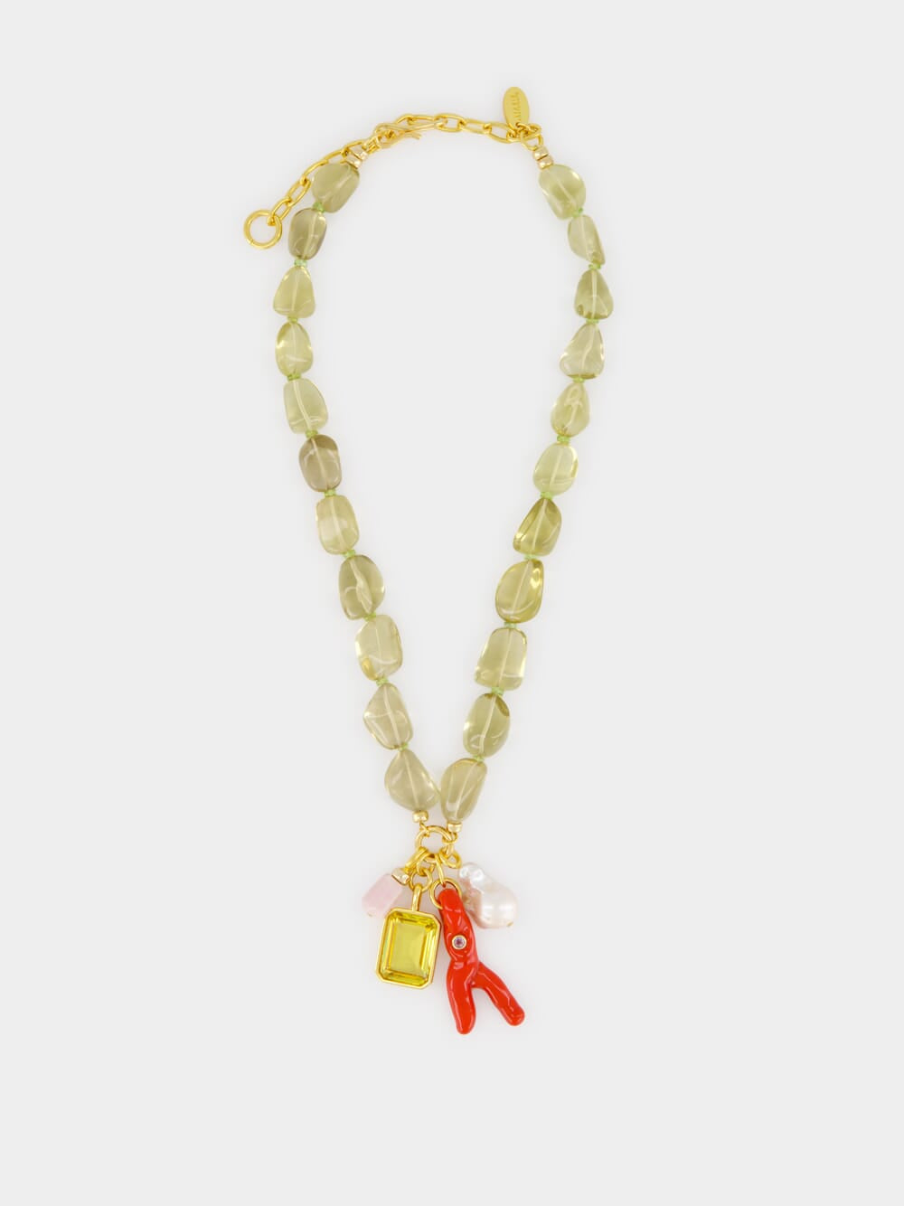 The Beaded Reef Necklace is an exquisite piece featuring lemon quartz and dotted peridot, along with Peruvian pink opal, green glass baguette, handmade glass red coral, and an oversized freshwater pearl. Crafted with gold-plated brass, this necklace embodies elegance and charm.