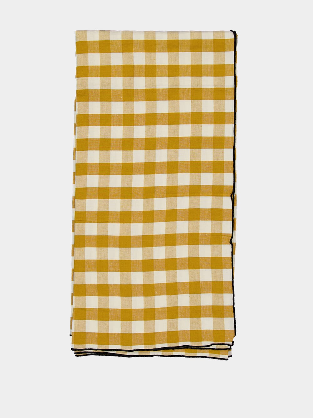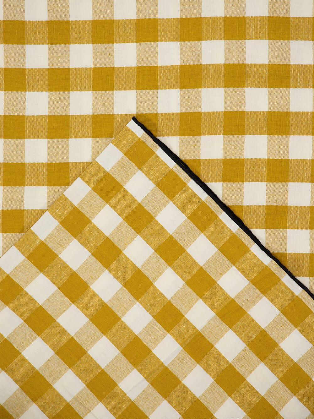 The Bourdon Black Mesh Gingham Rectangular Tablecloth in yellow is a perfect blend of elegance and practicality. Made from a blend of linen and cotton with two-tone threads, this tablecloth features a charming red and white gingham pattern with black mesh edging. Ideal for adding a rustic yet sophisticated touch to your dining table.