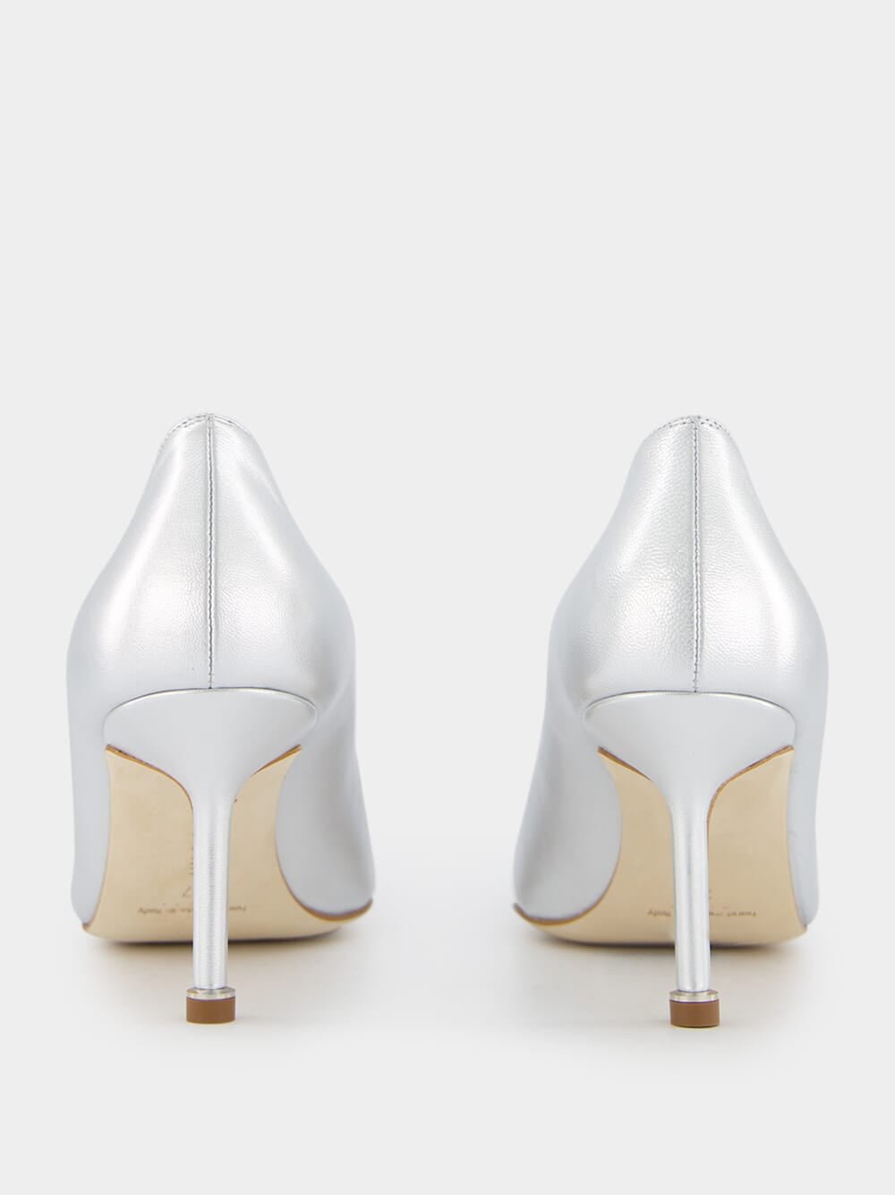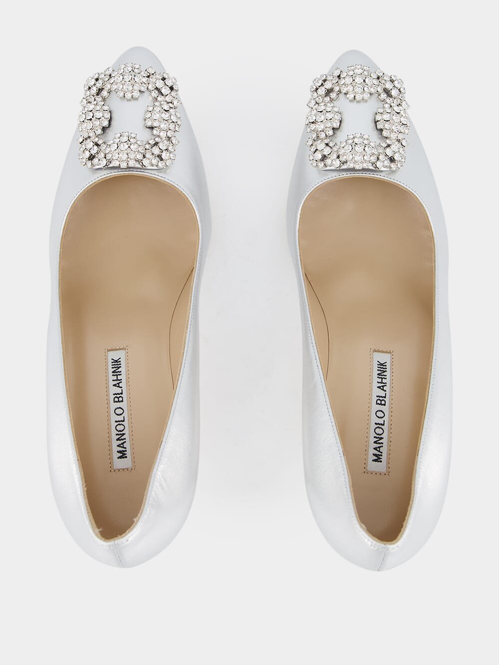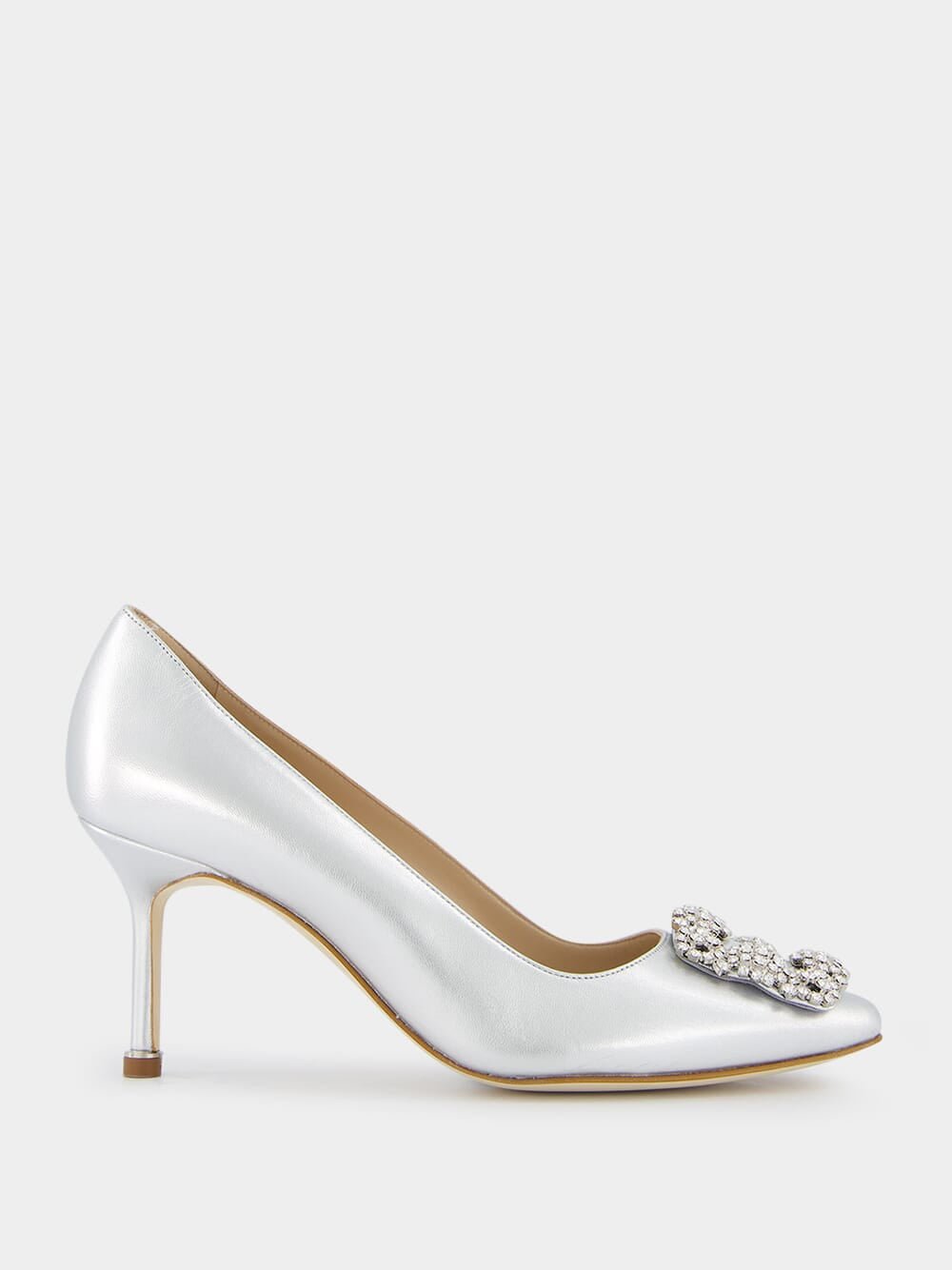 Hangisi 70mm pumps, crafted from premium silver nappa leather, these pumps showcase a chic almond toe design. The clear crystal buckle adds a touch of elegance and glamour to elevate your look.