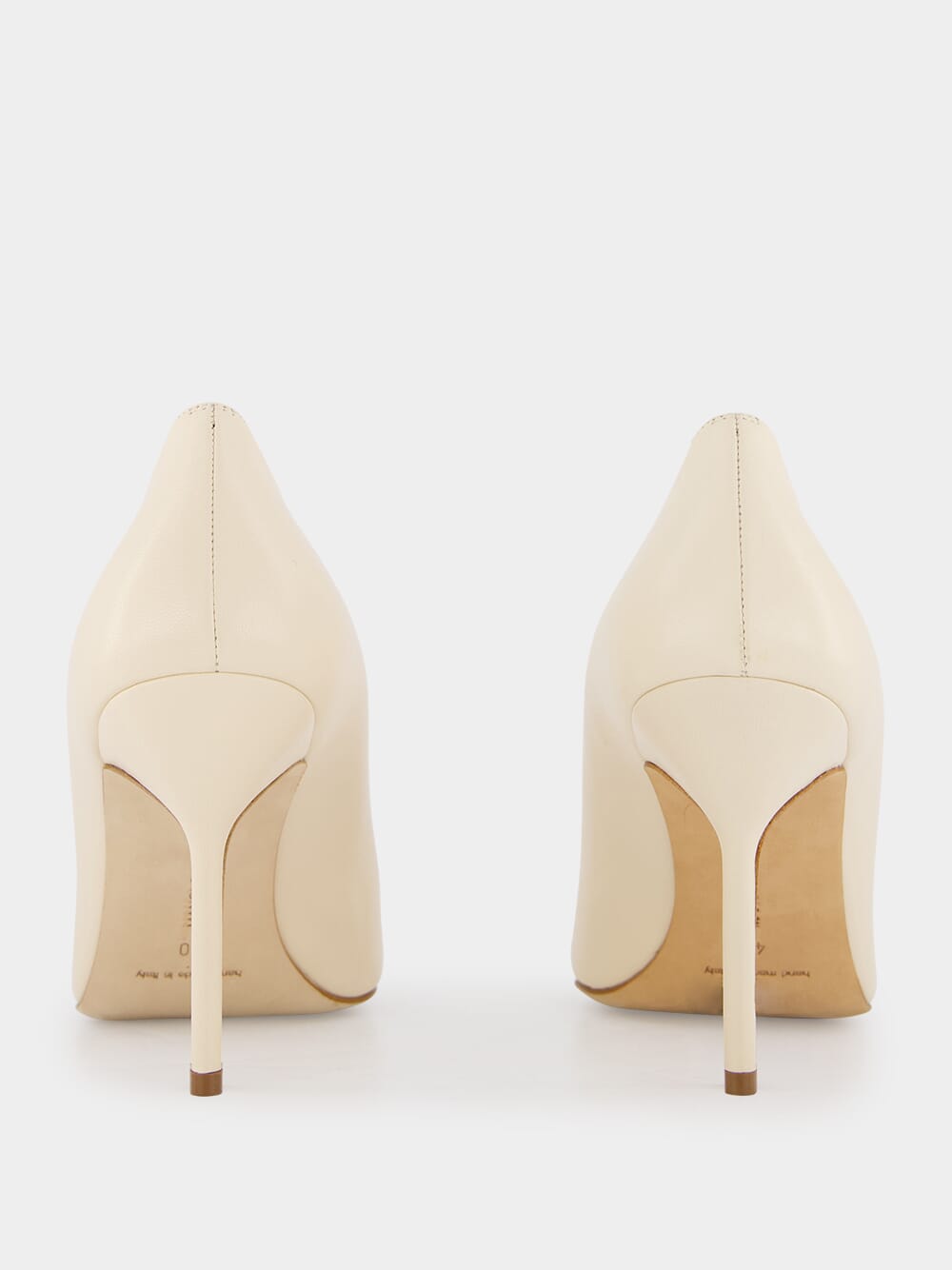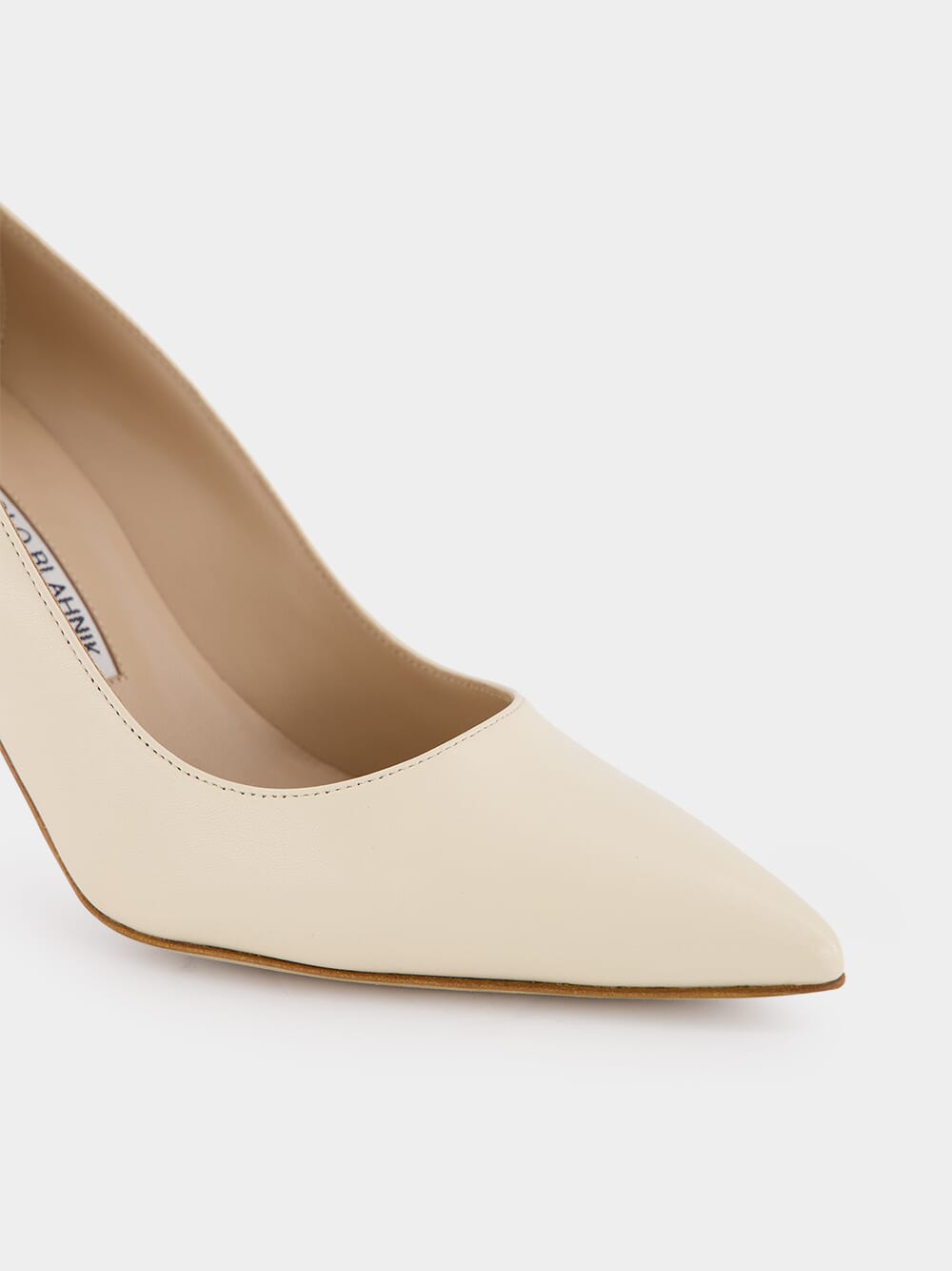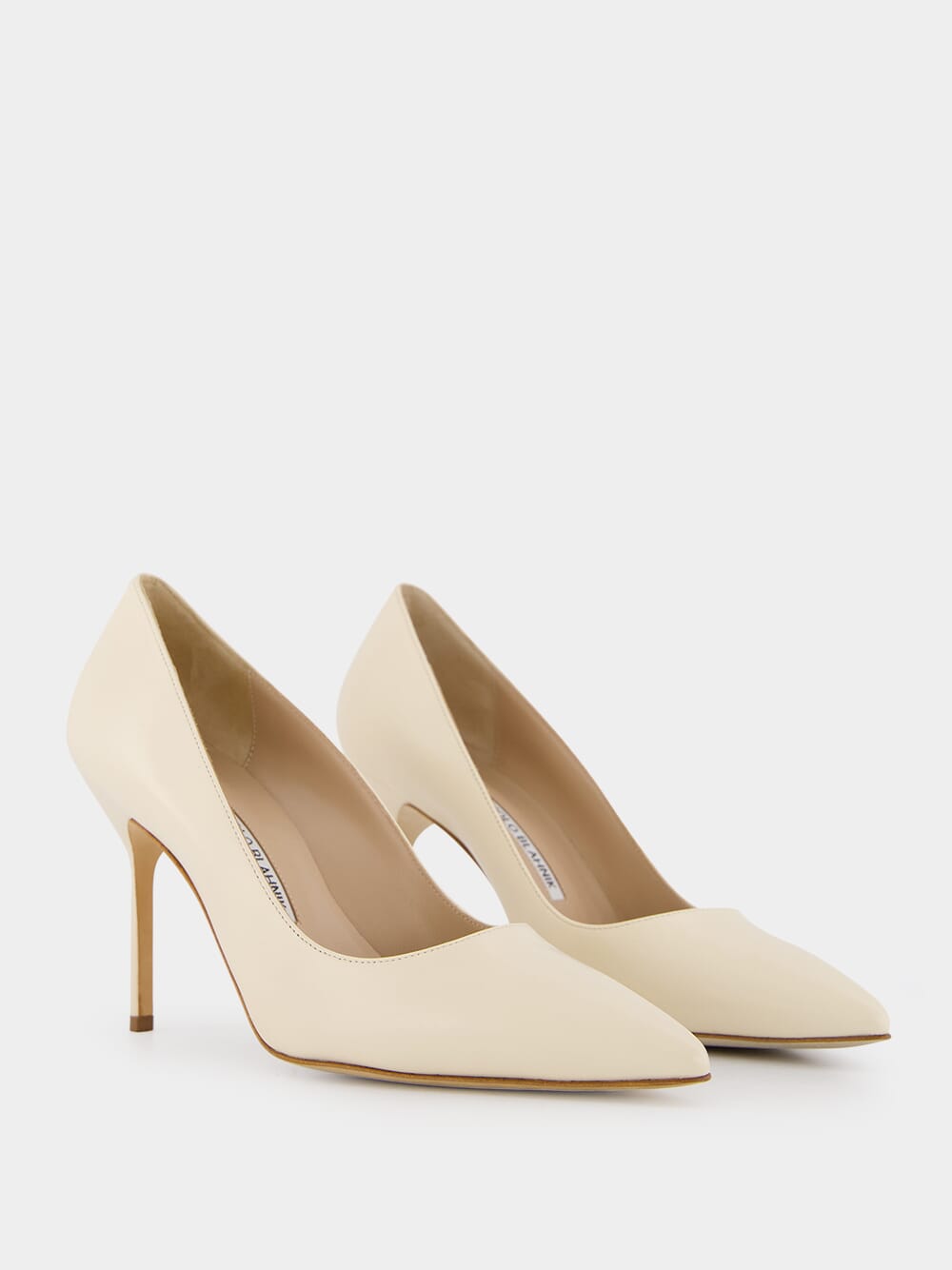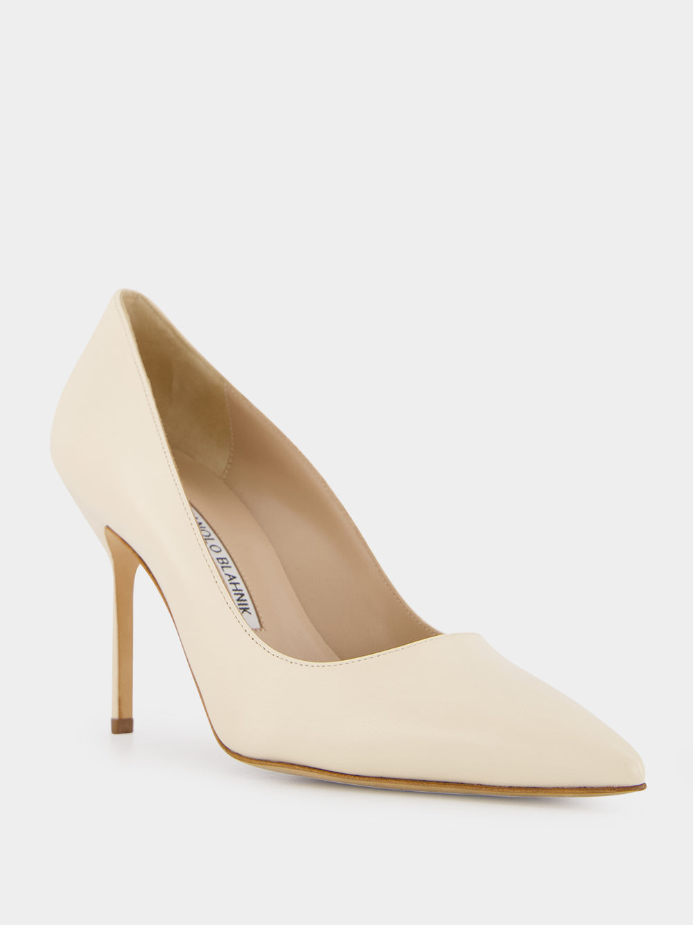 Manolo Blahnik BB 90 neutral calf leather pumps with pointed toe and stiletto high heel.