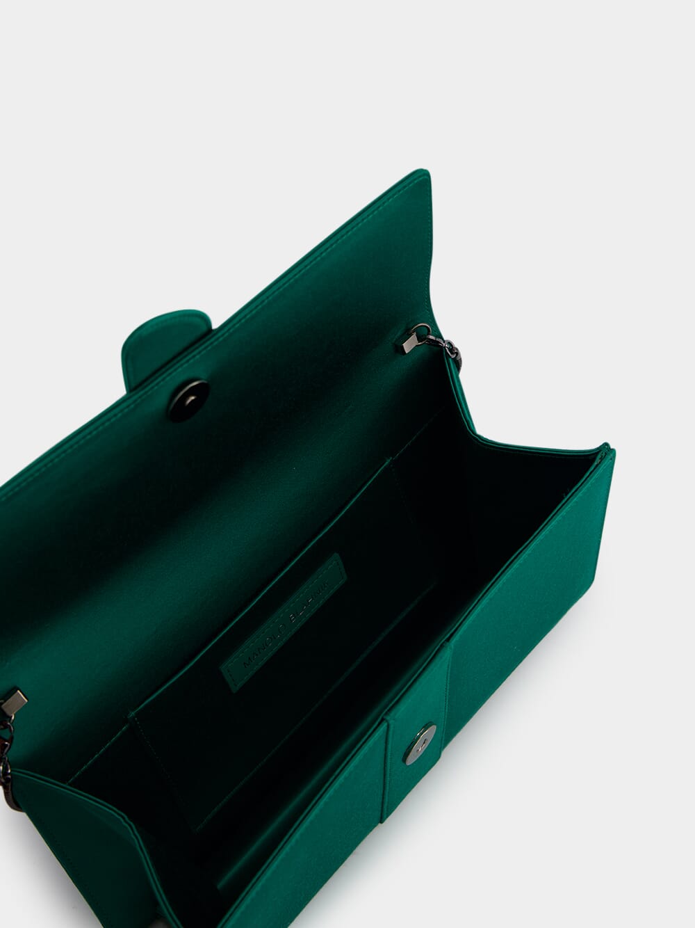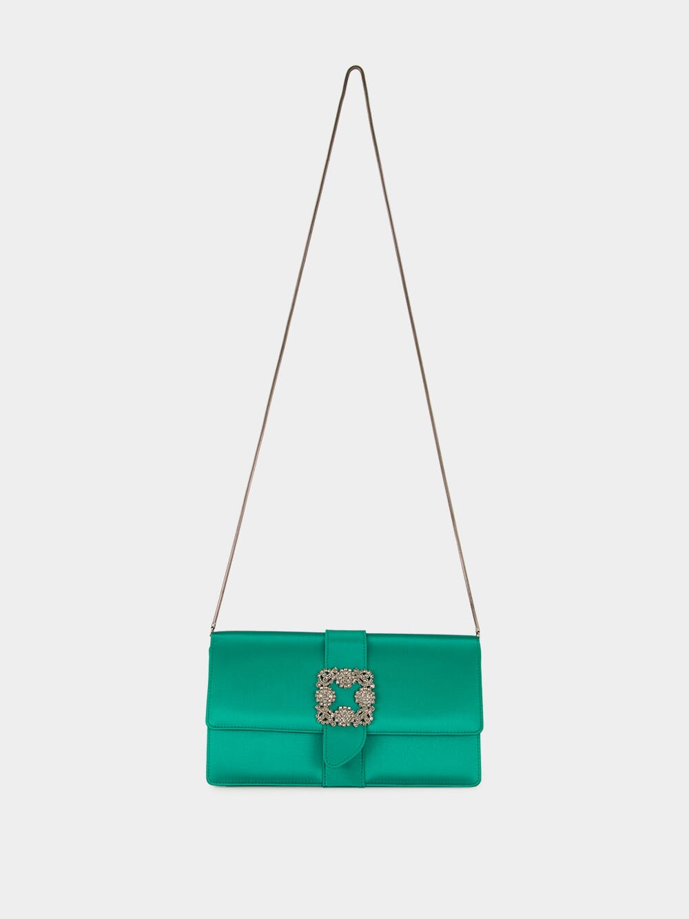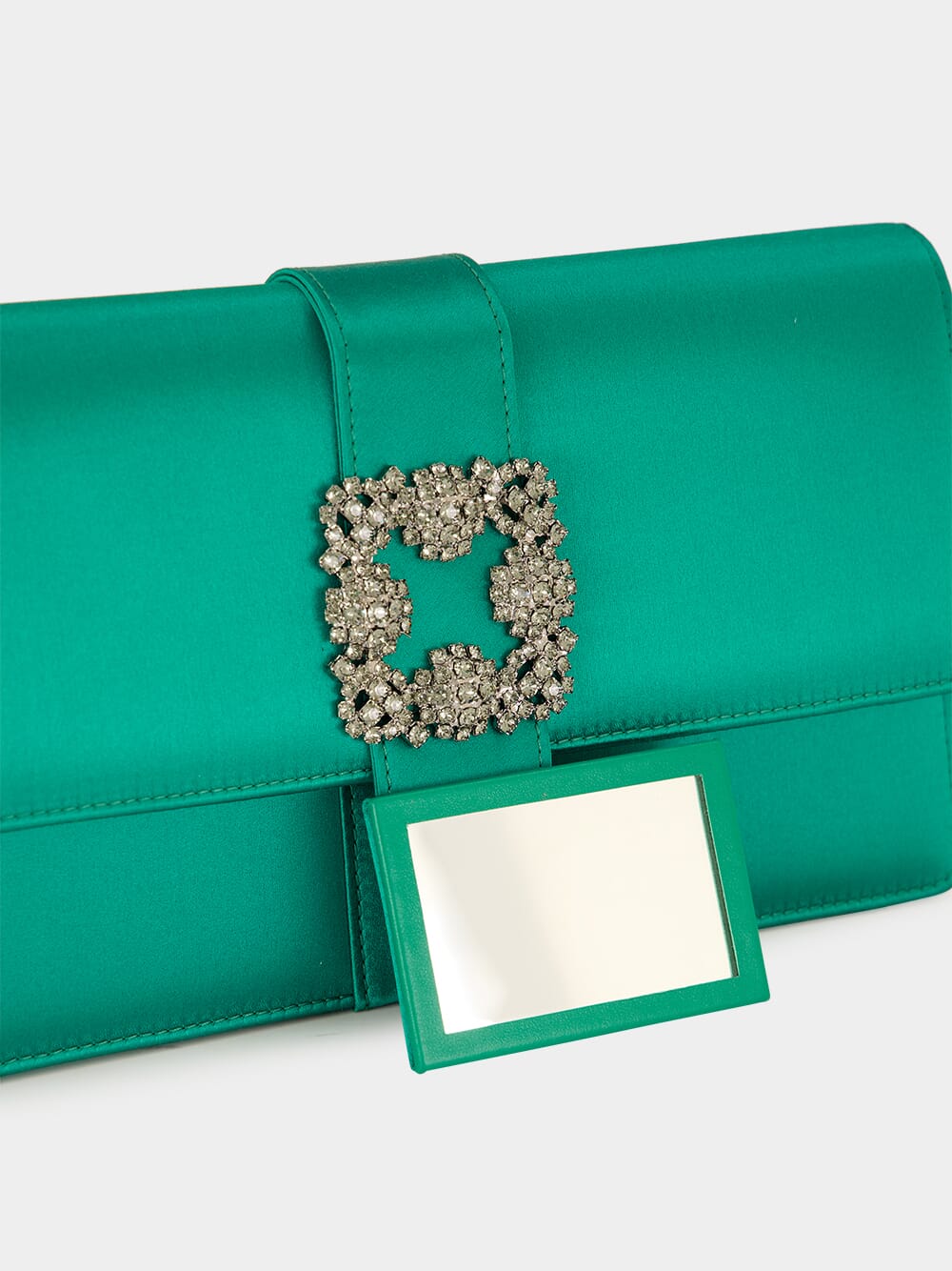 Manolo Blahnik Capri green satin jewel buckle clutch.