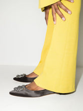 Manolo Blahnik Hangisi black satin almond toe flat ballerinas with a square crystal buckle.