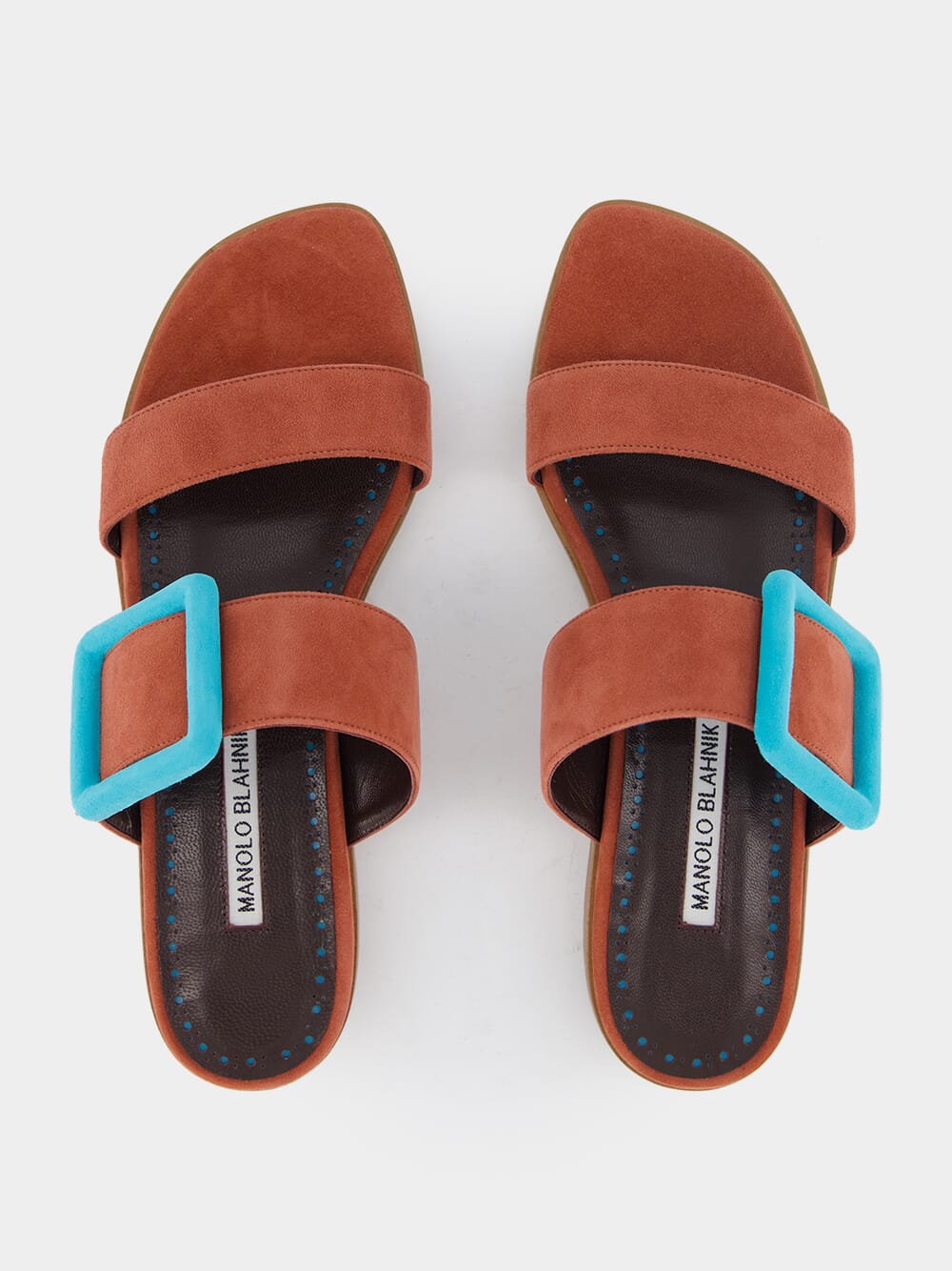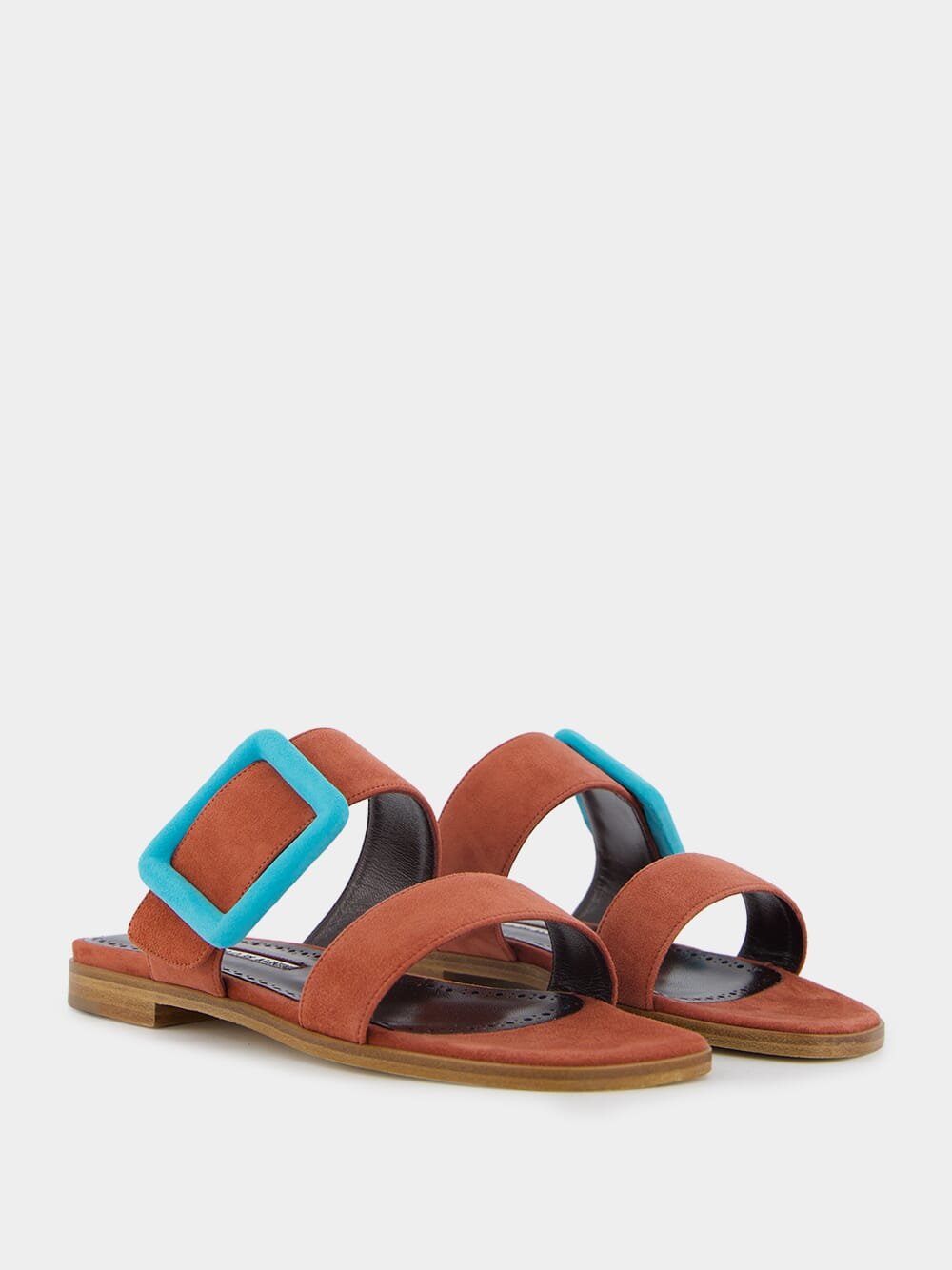 Titubaflatbi Flat Sandals, a perfect fusion of style and color. In line with Manolo's signature designs, these sandals showcase a vibrant color-pop that adds a touch of excitement to classic silhouettes.