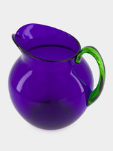 This elegant blue and green pitcher features a sleek, rounded design that adds a touch of sophistication to any table setting. Crafted from high-quality glass, it is perfect for serving beverages, combining both durability and aesthetic appeal. The pitcher’s vibrant blue hue with a contrasting green handle and classic shape make it a standout piece, ideal for both casual gatherings and formal occasions.
