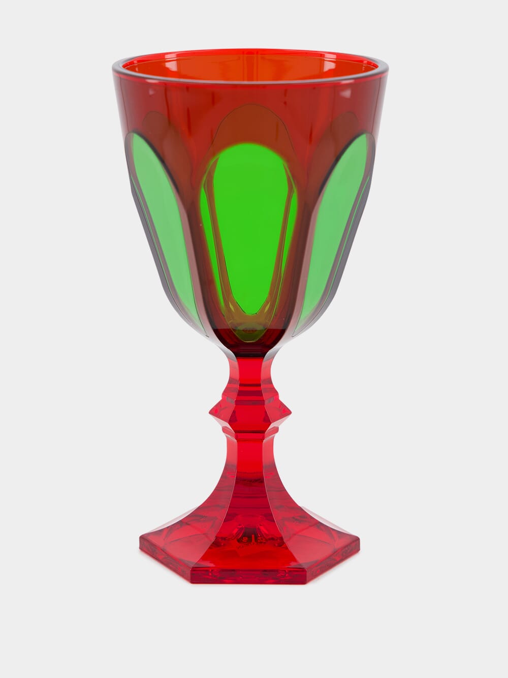 This exquisite wine glass features a striking ruby and green color combination, adding a touch of luxury to your table setting. The elegant design and rich hues make it a perfect choice for serving wine during special occasions and formal dinners. Crafted from high-quality glass, this wine glass ensures durability while exuding sophistication. Enhance your glassware collection with this captivating and stylish piece.