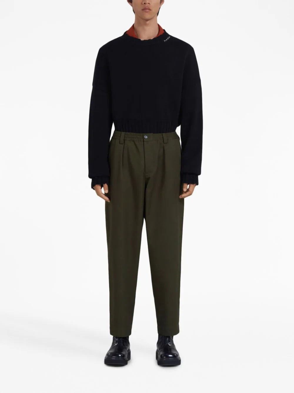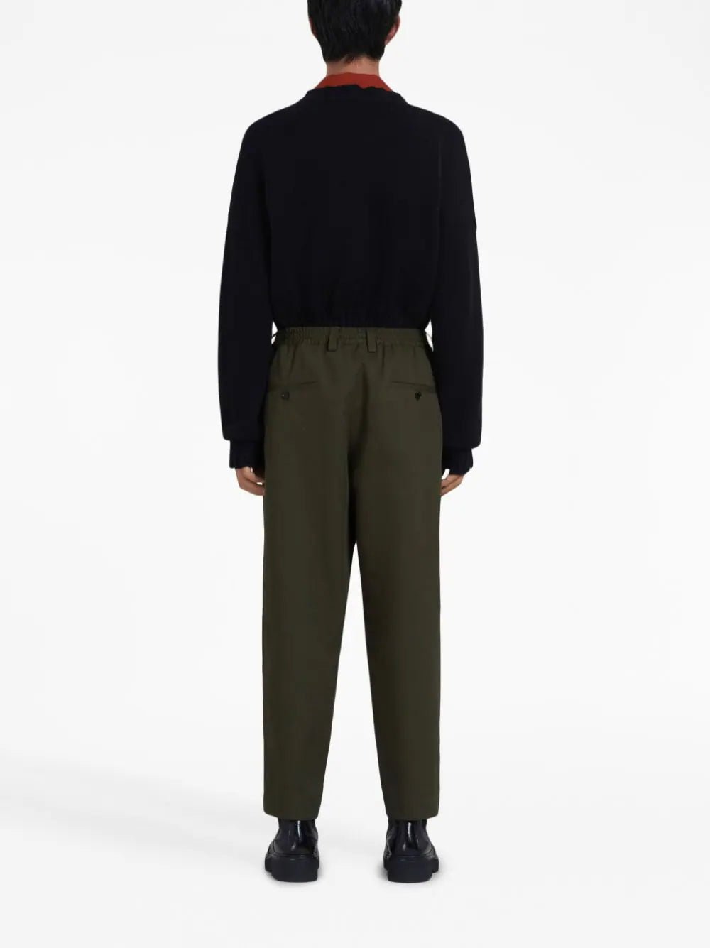 Mid-Rise Tapered-Leg Cotton Trousers, crafted to perfection for the modern fashion enthusiast. These trousers boast exquisite pleat detailing that adds a touch of sophistication to your ensemble. Designed with an elasticated waistband and a flattering mid-rise fit, they offer supreme comfort without compromising on style. Equipped with belt loops, front button, and zip fastening, these trousers ensure a secure and personalized fit. With two side inset pockets and two rear button-fastening pockets, you'll have ample space to keep your essentials close at hand.