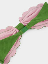 This green strapless bikini top, known as the Antibes Top, embodies timeless elegance and sophistication. Crafted from high-quality Italian fabric with a textured basketweave finish, it features raw, hand-cut scalloped edges for a chic touch. The boning provides a flattering silhouette, while the fully lined design ensures comfort and durability. Secured with a back clasp, this quick-drying piece is perfect for sunny escapes. Its minimal coverage and snug fit make it ideal for pairing with various bikini bottoms for a stylish beach look.