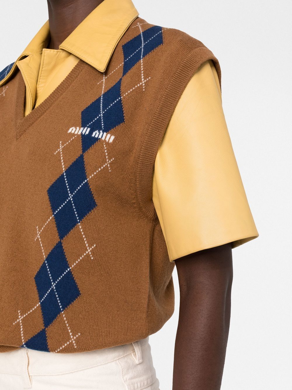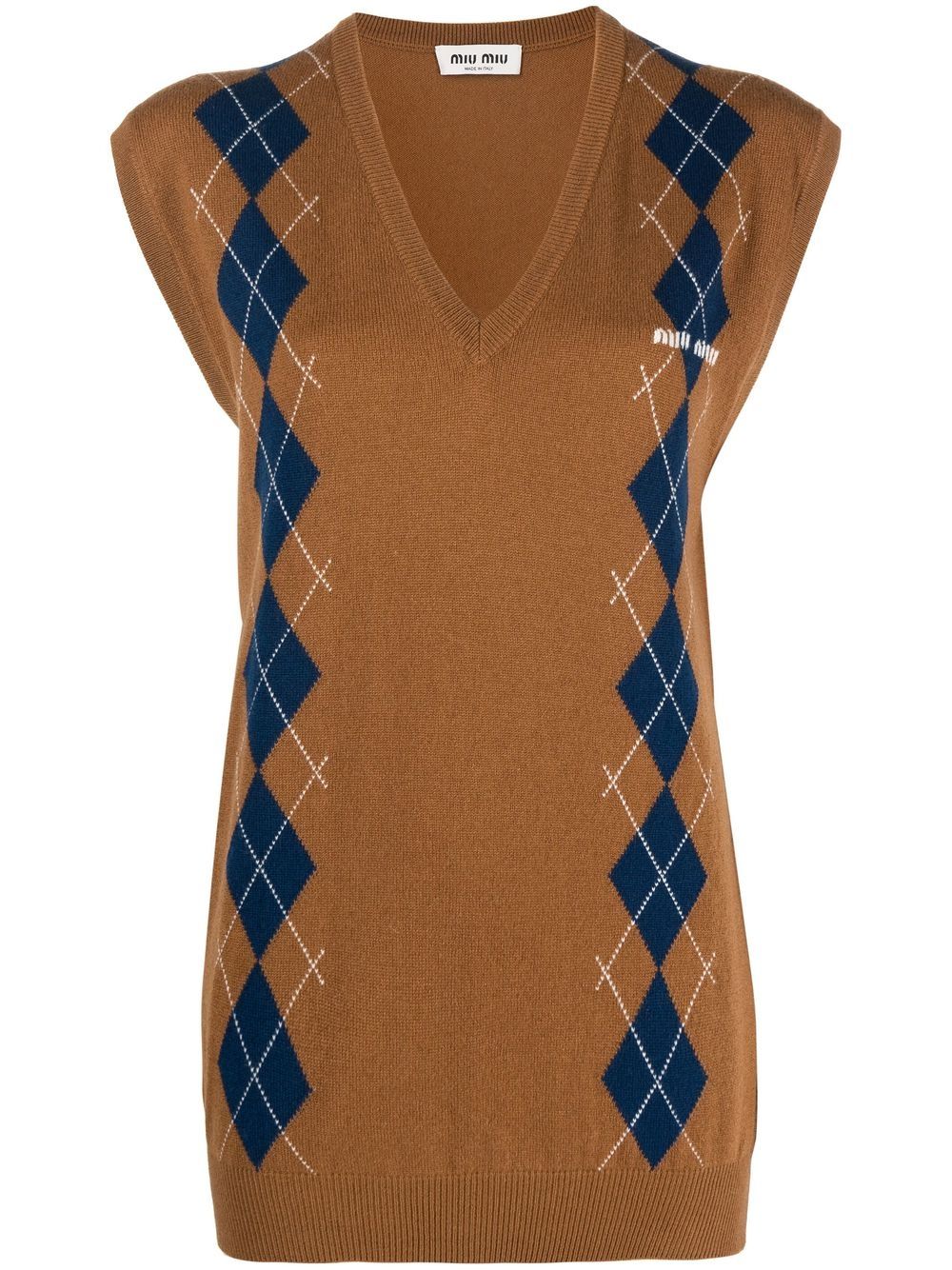 Miu Miu brown cashmere vest with blue argyle intarsia motif and ribbed knit hem.