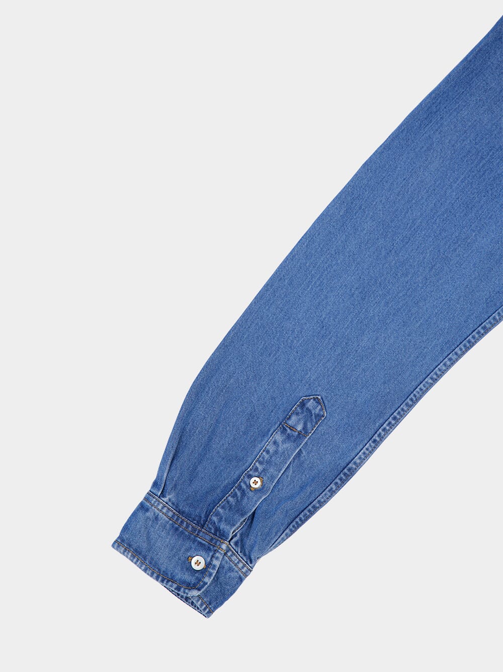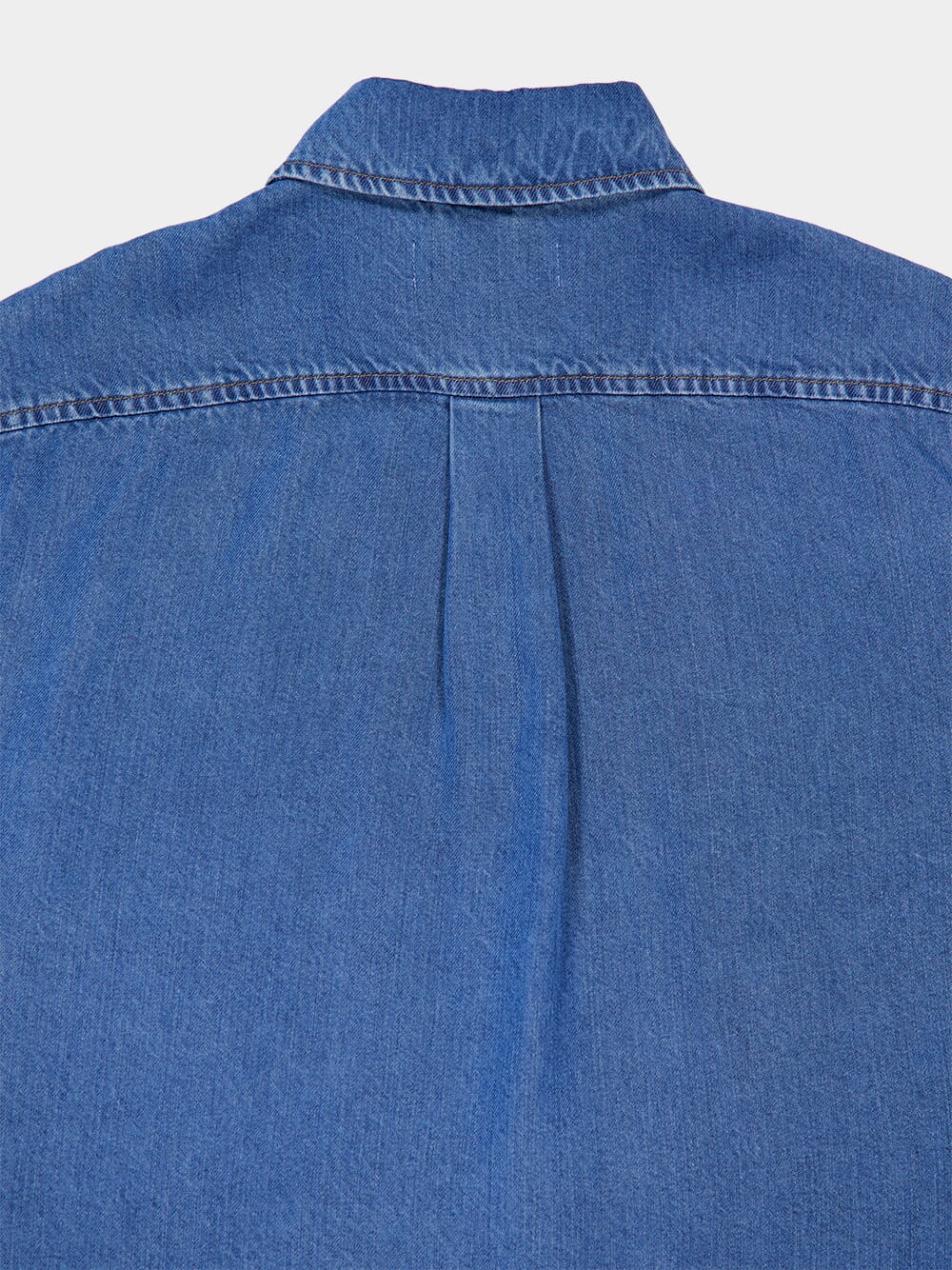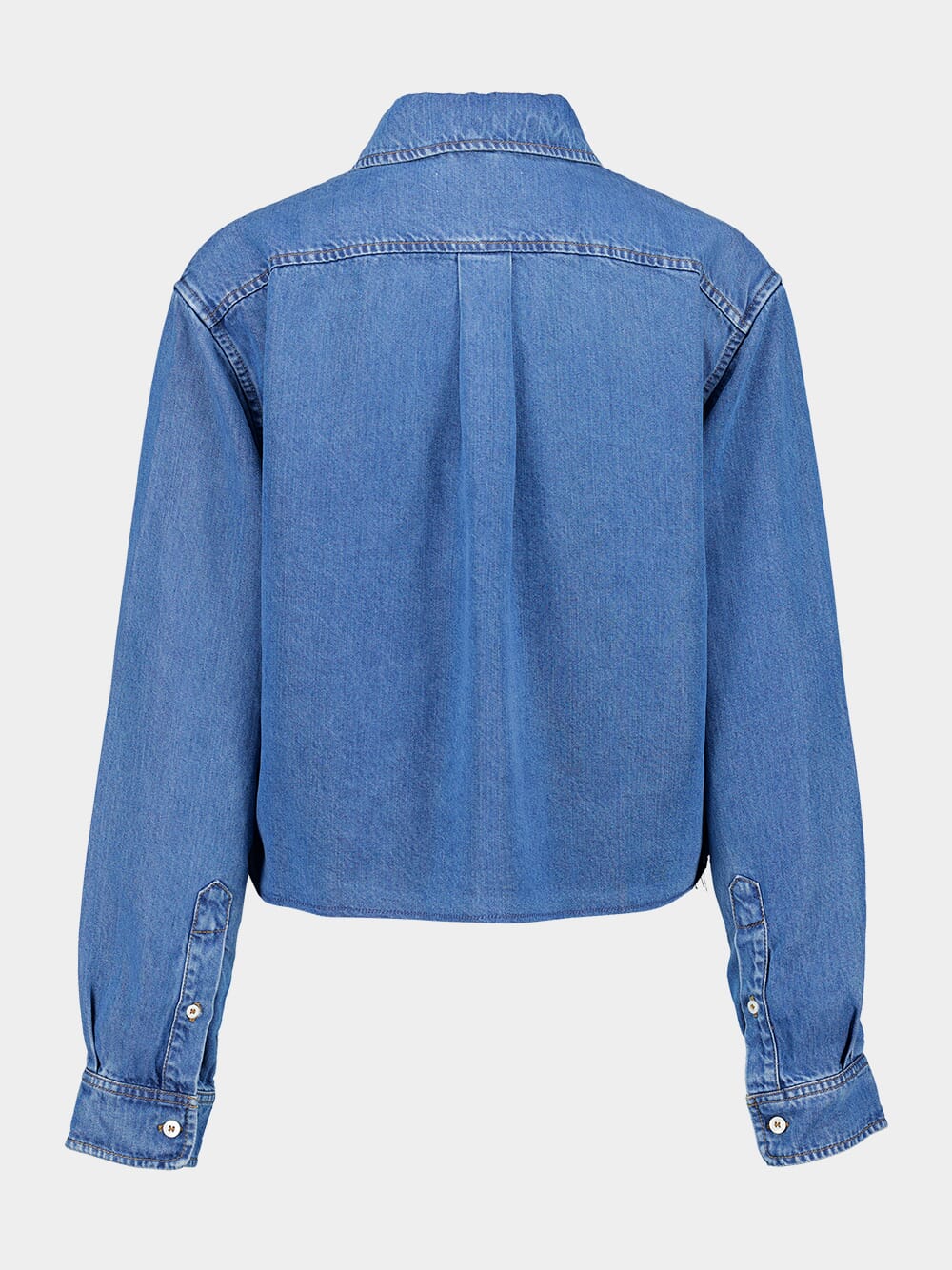 The navy denim shirt exudes unmistakable style with its boxy lines and raw-cut hem, giving the garment a contemporary character. Enhanced with a washed treatment, this shirt features a shirt collar, front button closure, and contrasting stitching. The embroidered logo adds an iconic note, completing its modern look. Unlined and versatile, it's perfect for casual chic ensembles.