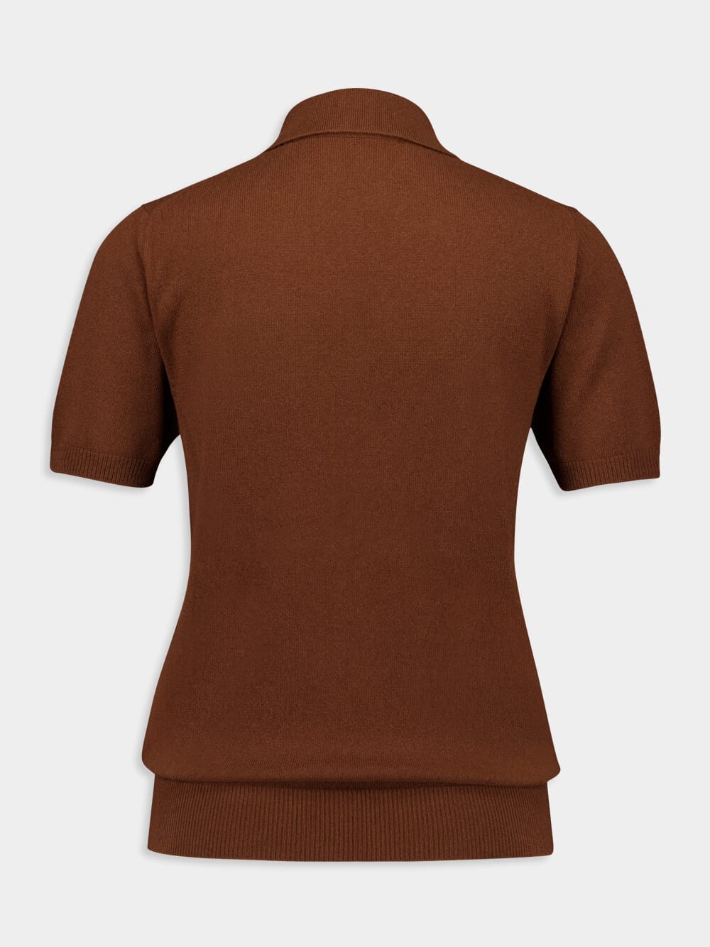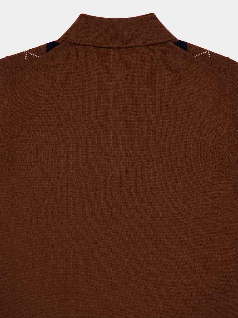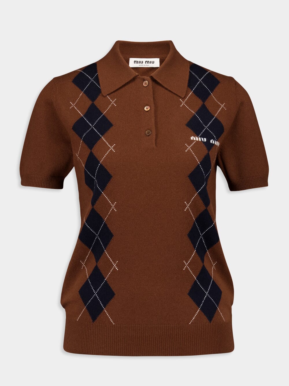 This tobacco cashmere knit polo shirt features a refined intarsia motif paired with an argyle pattern, creating a sophisticated look. The Miu Miu logo adds an iconic touch. Designed with a slim fit, semi-raglan shoulder, and ribbed knit cuffs and hem, it offers both style and comfort. The three-button front closure completes this elegant piece.
