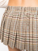 Miu Miu retro brown wool checked mini skirt with embroidered logo and plaid design.