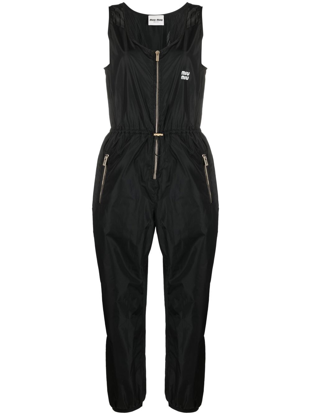 Miu Miu black jumpsuit in blend silk with openwork detail on top featuring a zipper closure, adjustable elastic drawstring waist, elasticized leg bottom contrasting a logo print on the chest.
