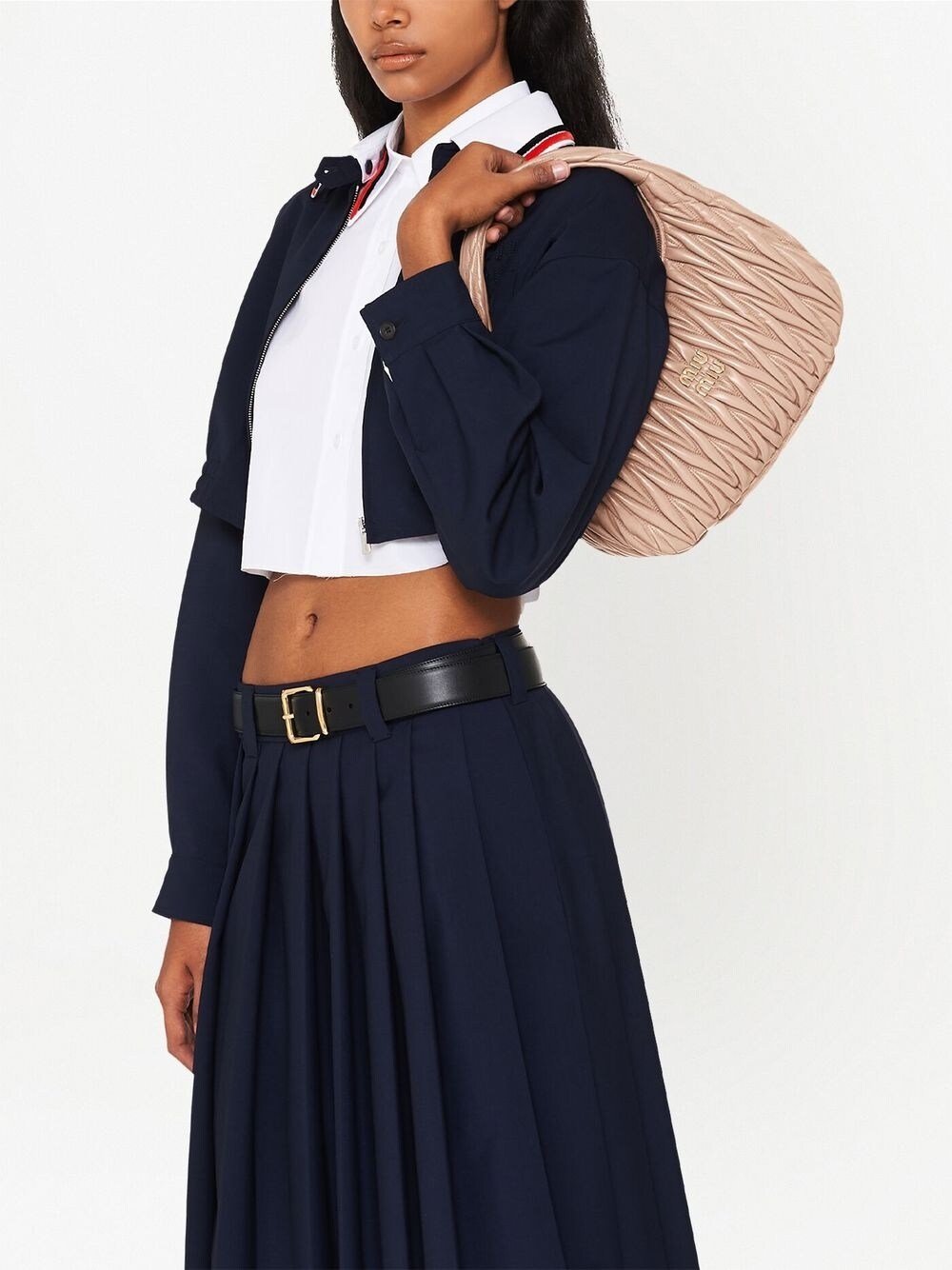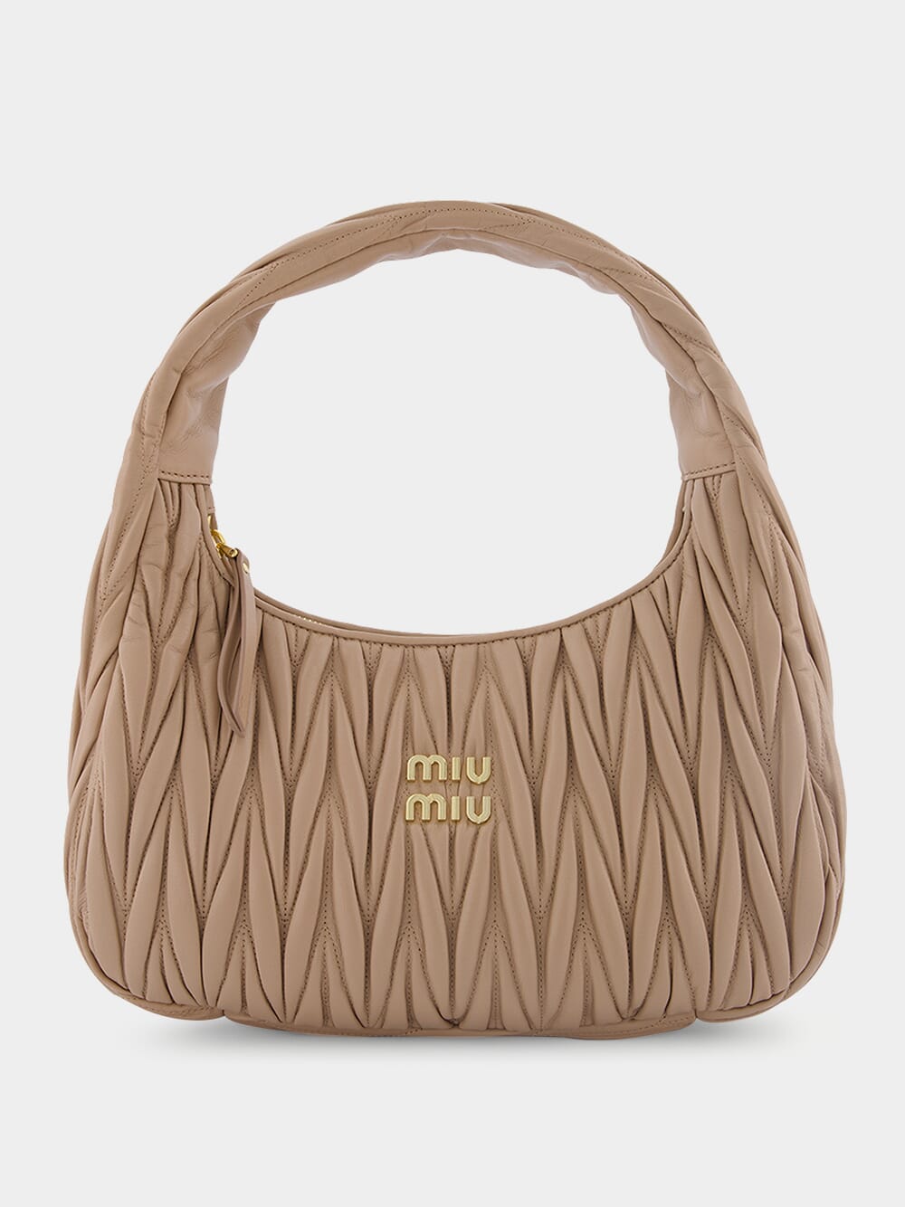 Miu Miu Wander bag in nappa leather with matelassé texture, gold tone hardware and metal lettering logo oh the front.