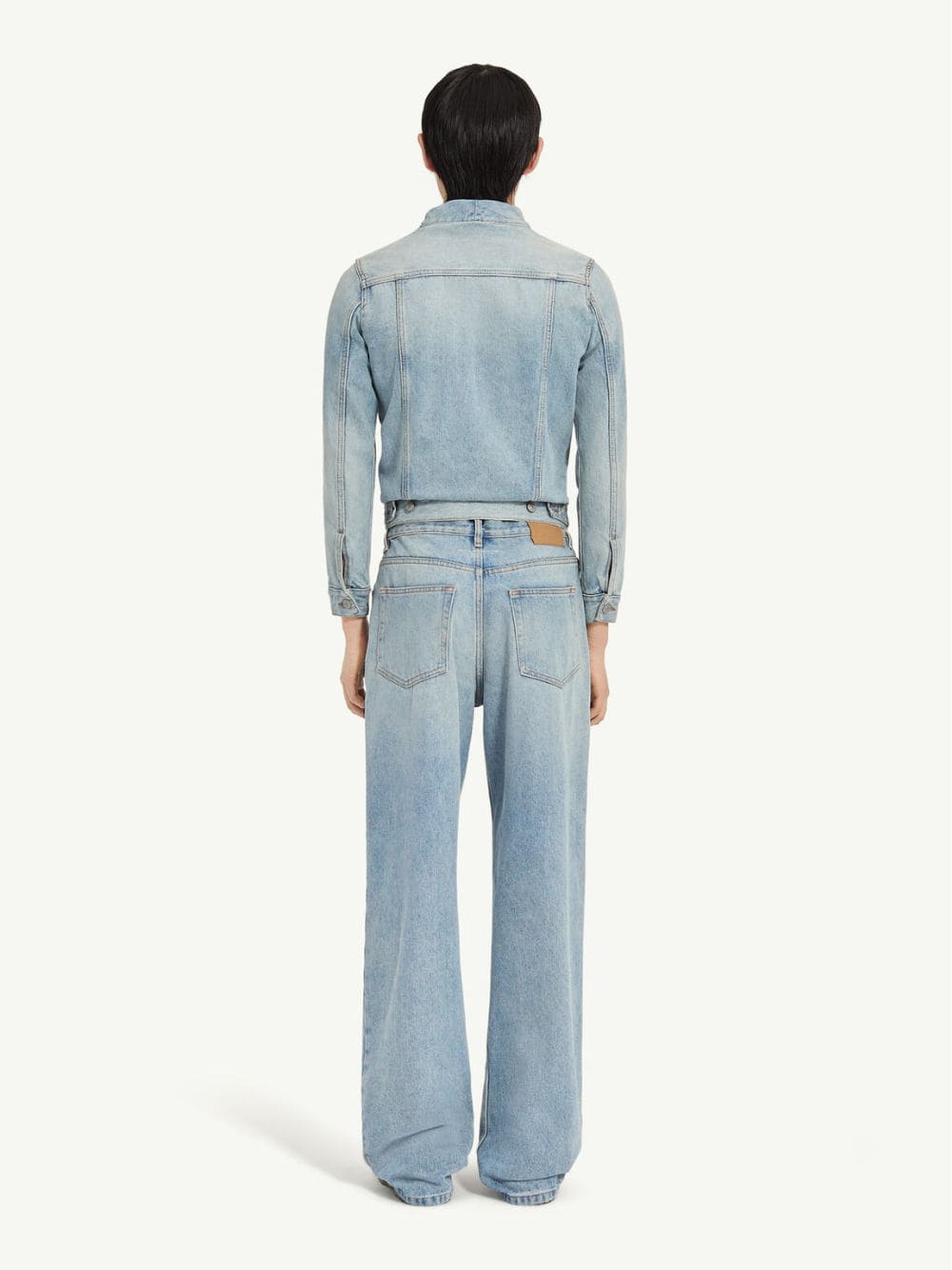 These light blue denim trousers are designed with a flattering high waist and a timeless straight-leg silhouette. Featuring a classic 5-pocket design, they are completed with a zip and button closure and practical belt loops for versatile styling. The light wash adds a casual yet refined feel, while the signature white stitch line and MM6 numeric jacron label at the back highlight the Maison's creative identity. Made from 100% cotton and crafted in Italy for a high-quality finish.
