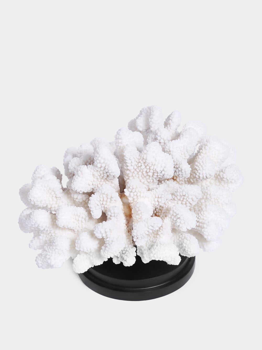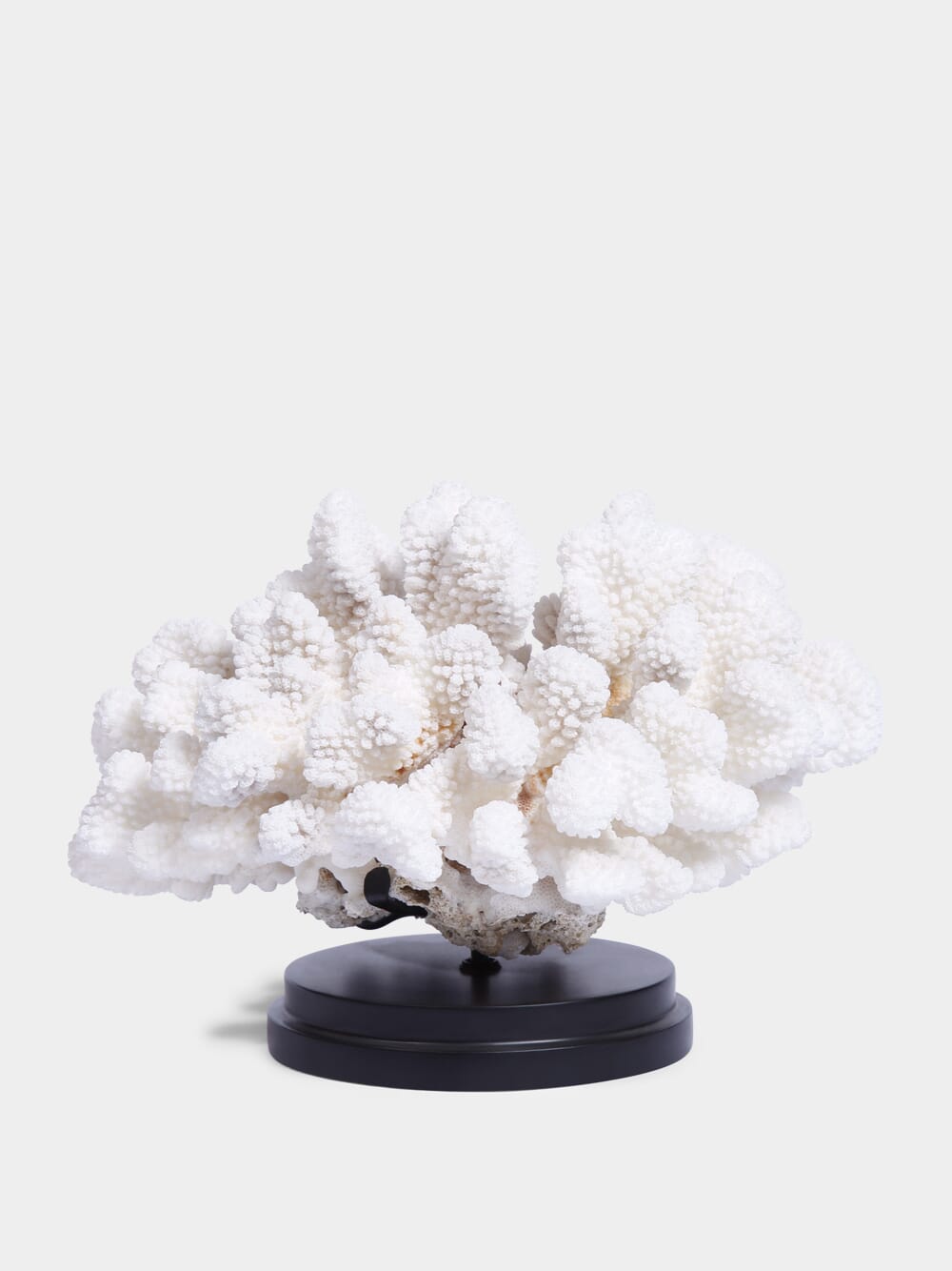 A delicate and intricate display, this Pocillopora Meandrina coral, mounted on a chic black base, adds a touch of refined elegance to any space with its pristine white hue.