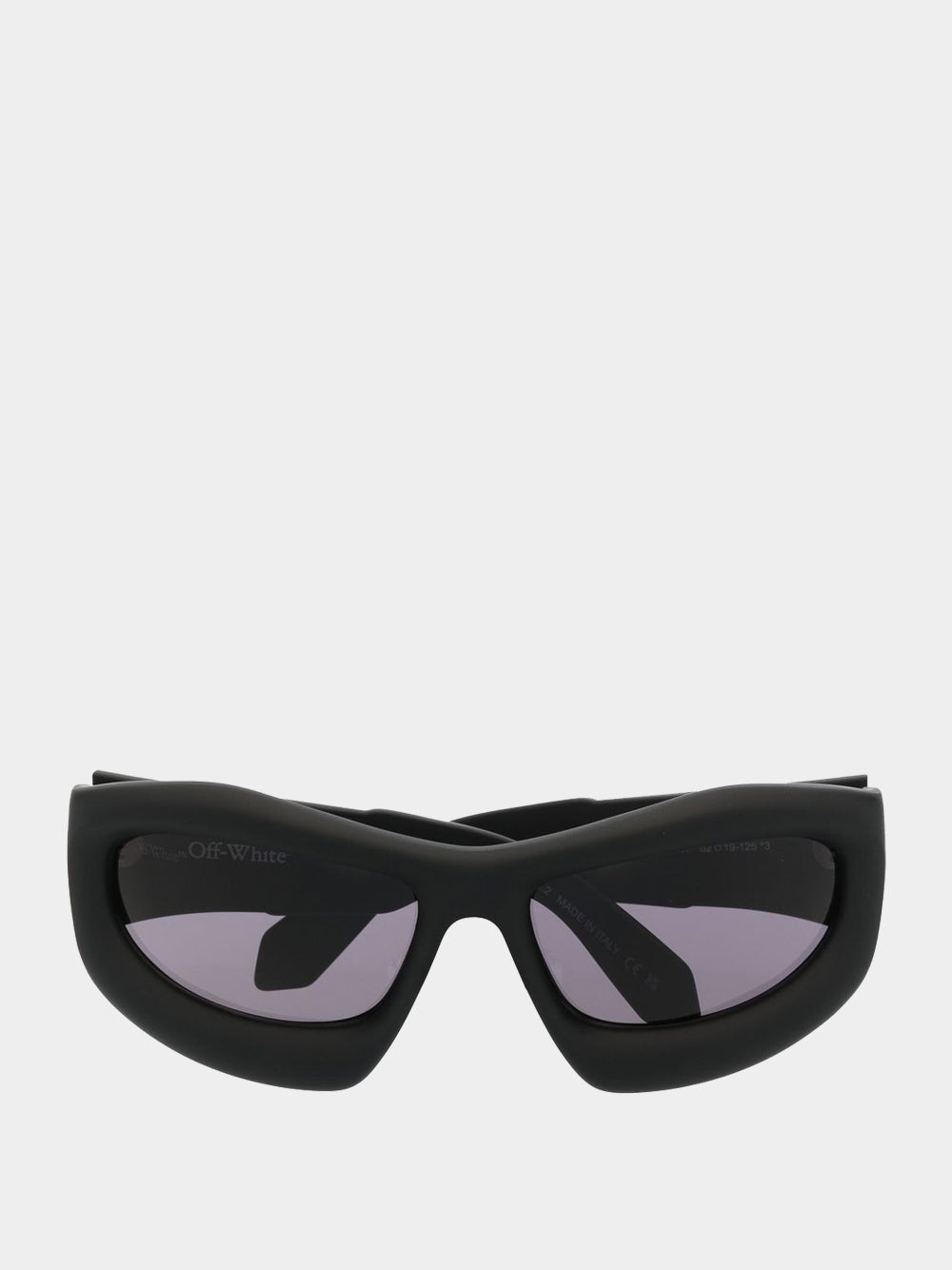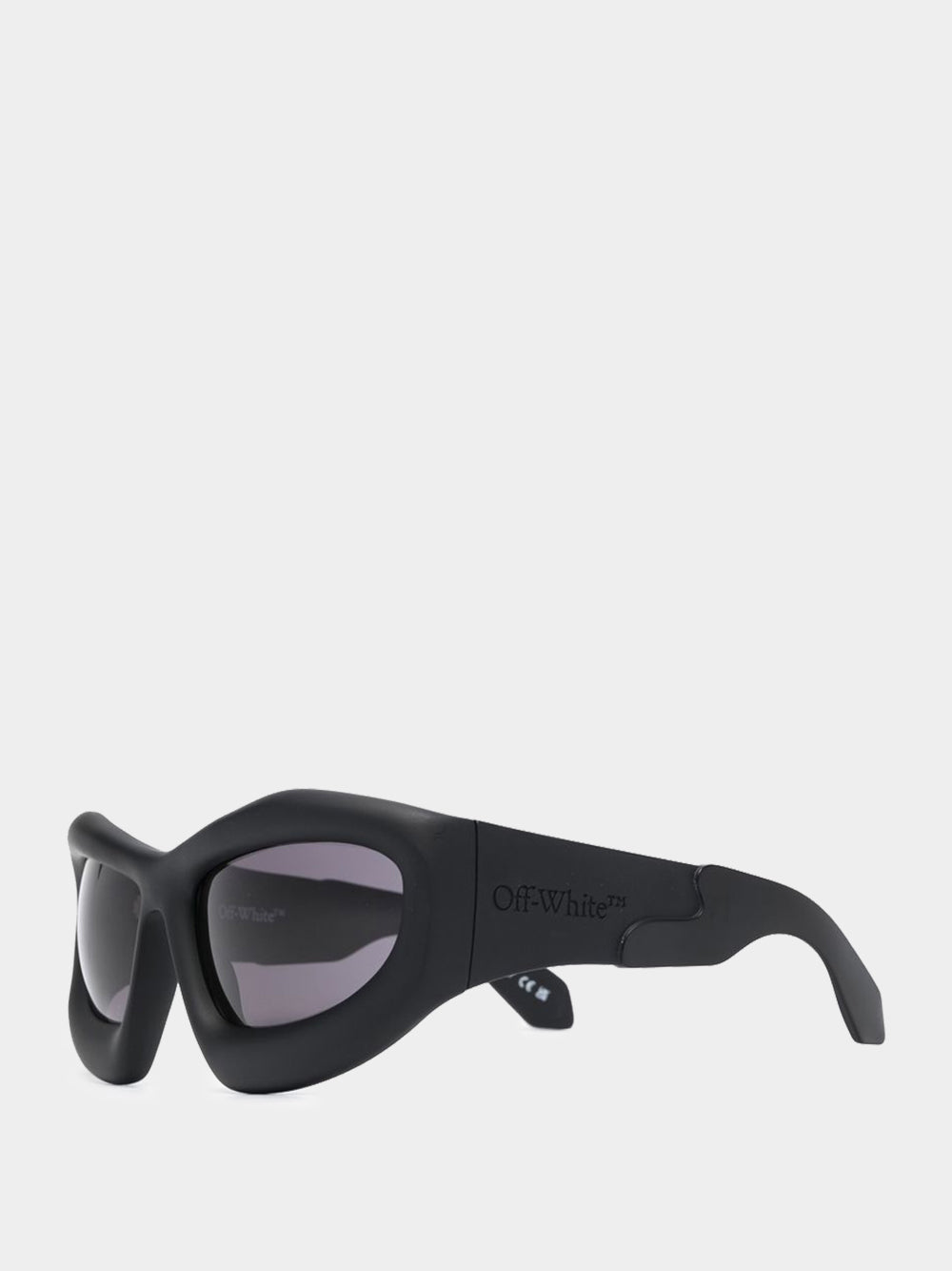 Off-White Katoka sunglasses with oval shape and dark grey lens. Logo engraved on the lens. Tonal Off-White logo at side.