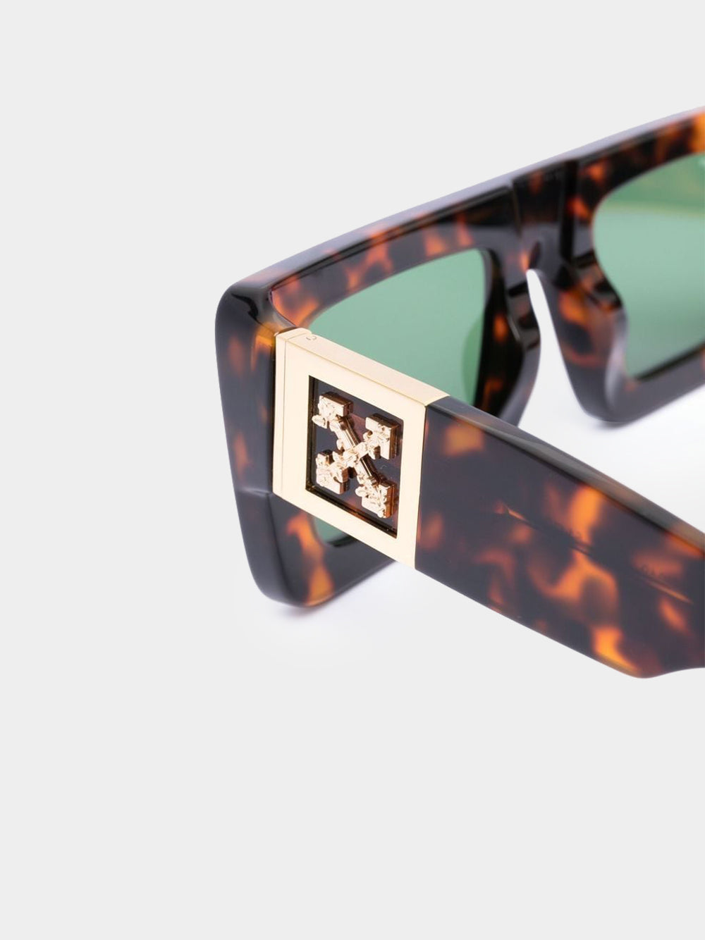 Off-White Leonardo rectangular sunglasses featuring square frame, tinted lenses, UV-protective lenses, lens decal, signature Arrows motif, straight arms and curved tips.