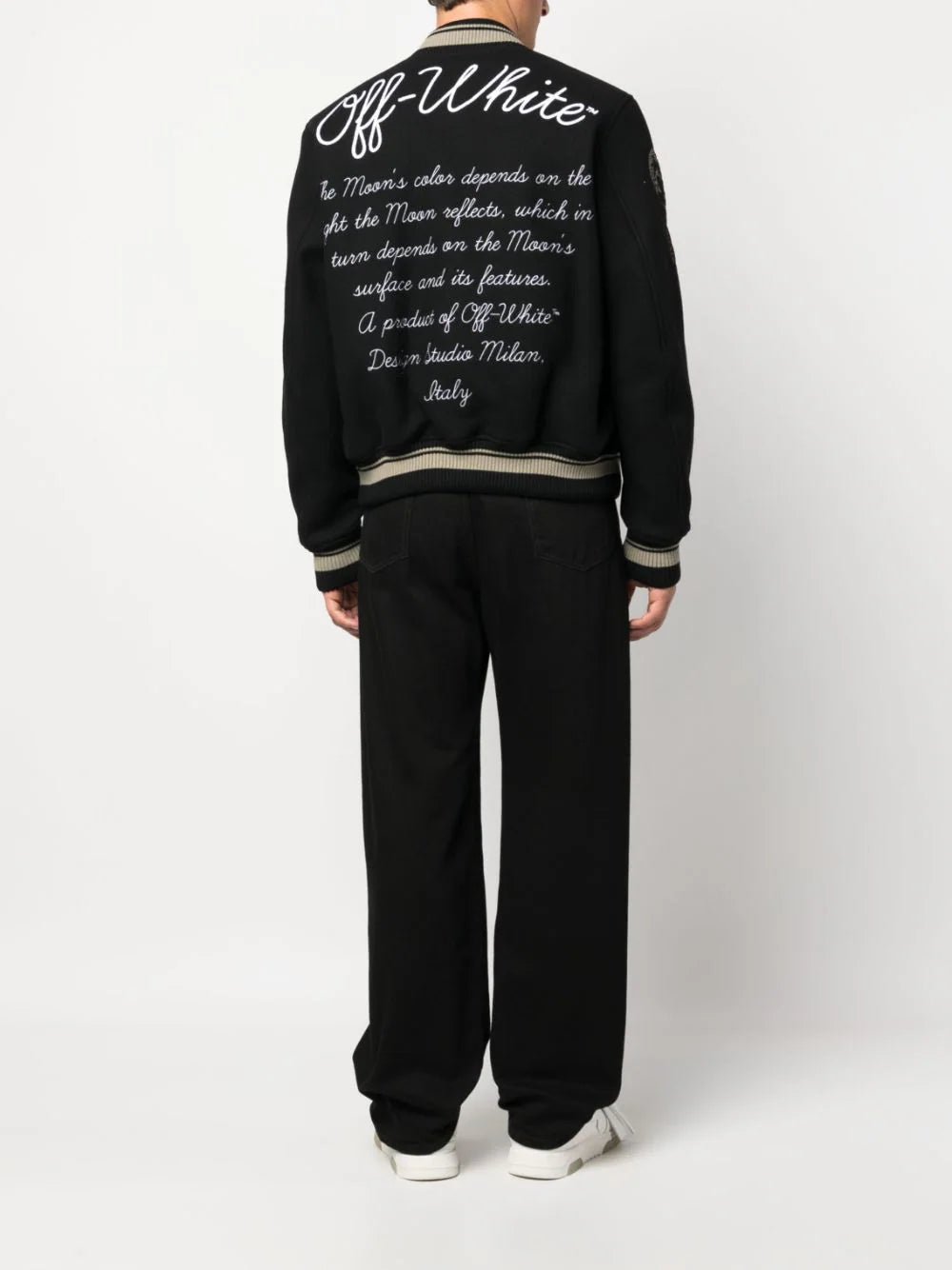 Logo-Appliqué Bomber Jacket, adorned with a striking logo patch at the chest and accentuated by a distinctive stripe trim, this jacket exudes contemporary charm. The graphic-print sleeves, logo print, and slogan print at the rear add an edgy touch, while the ribbed band collar and front button fastening showcase timeless appeal. With long sleeves, ribbed cuffs, and hem, along with two side slit pockets, this jacket offers both comfort and functionality.